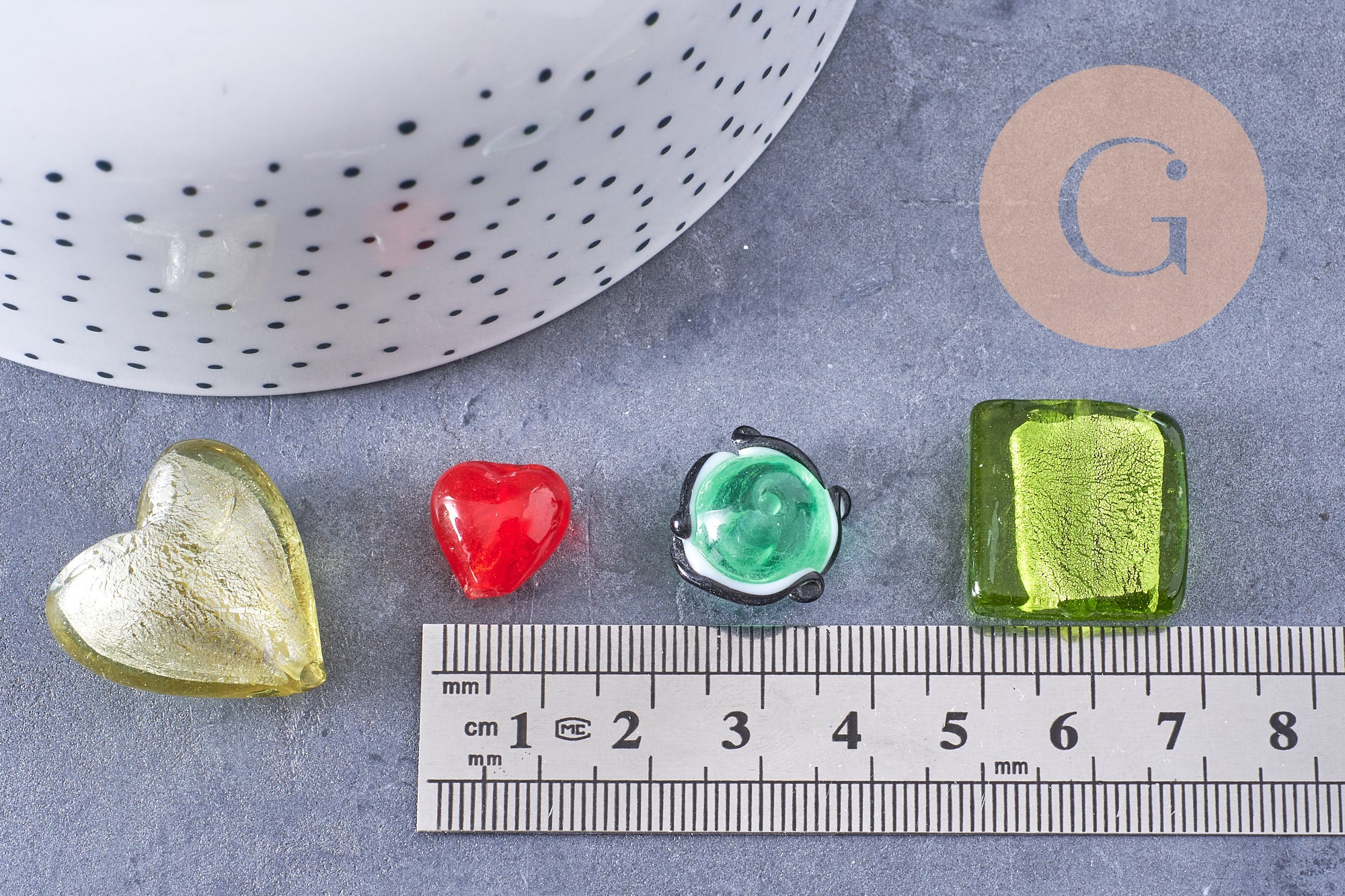 Add an artistic and colorful touch to your creations with this set of Murano glass beads , in multiple shapes, sizes and colors , all unique. These handcrafted beads contain silver leaf inclusions, giving them shine and refinement.