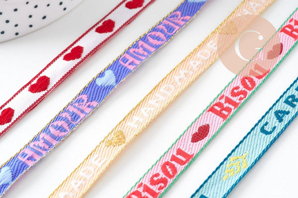 Add a romantic and elegant touch to your creations with this embroidered ribbon with the following words: "Love" "Kisses" "Handmade" "Carpe Diem" of 10mm in shades of iced brown, red, blue and purple