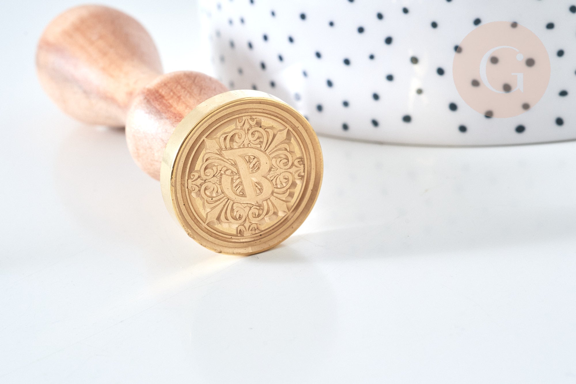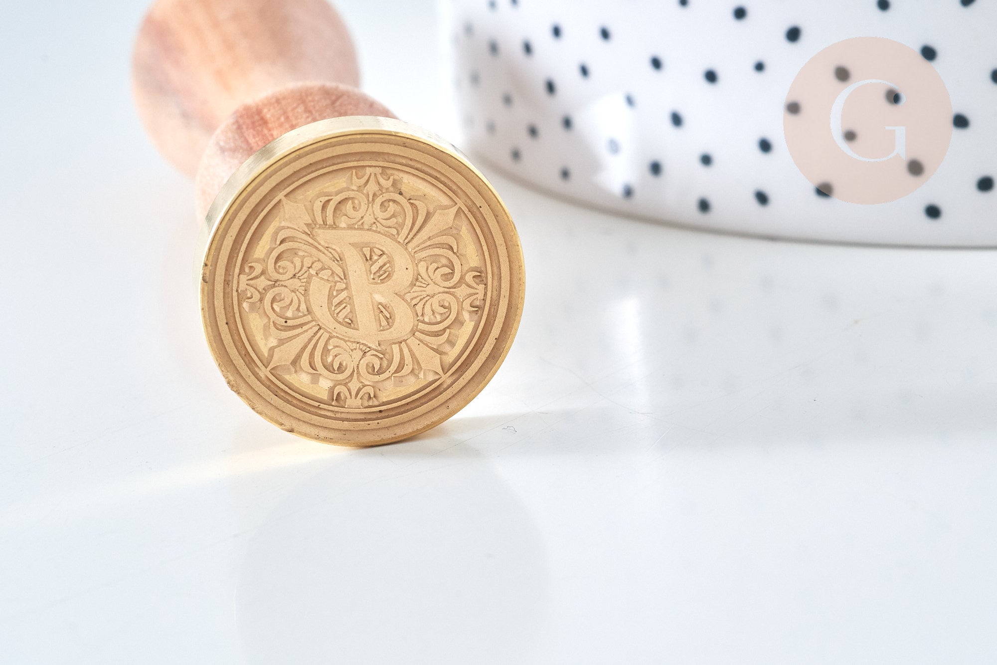 A metal and wood letter B seal for sealing wax, a supply for creating personalized seals for your DIY wedding invitations