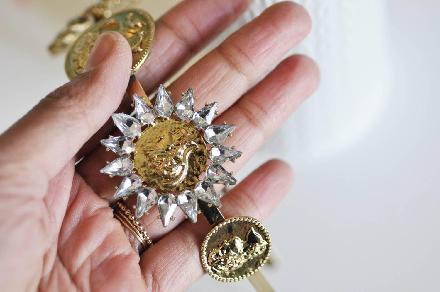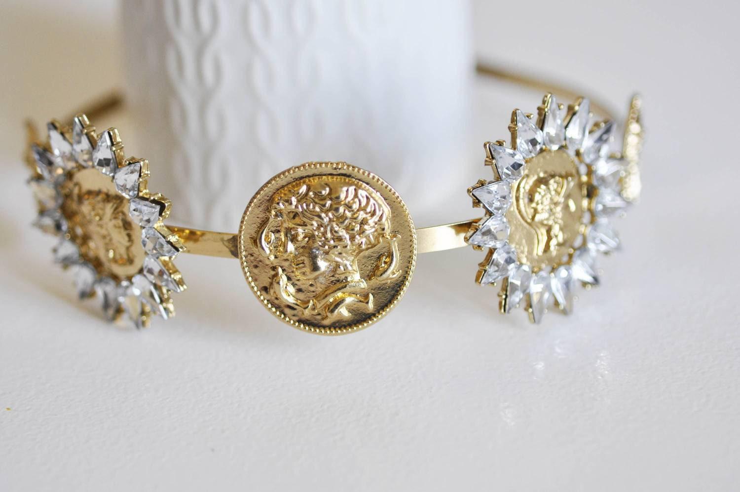 Gold rhinestone medal hair headband, hair accessories, hair clips, wedding accessories, hair decoration, 120mm A gold metal (iron) hair band, to adopt immediately for a formal outfit. The medals recall the antique theme and are also decorated with rhinestones. Metal:...