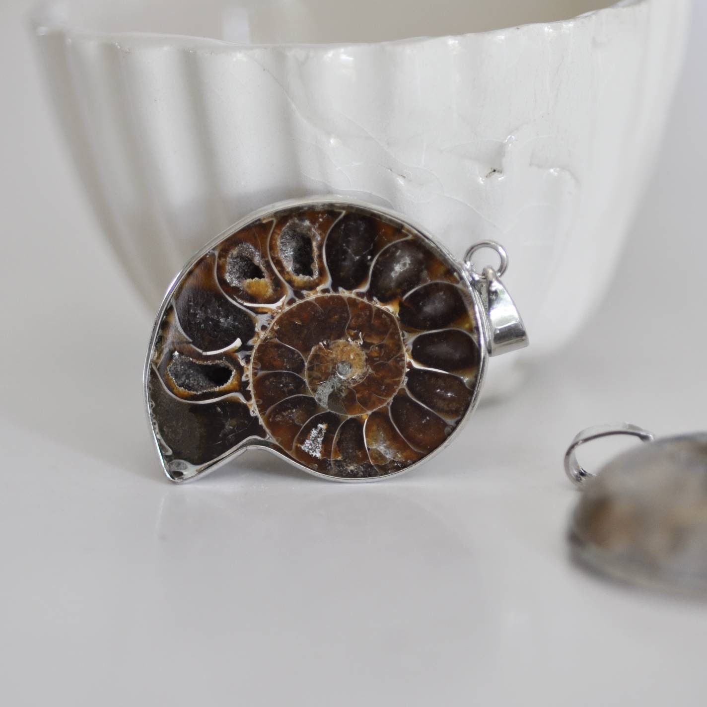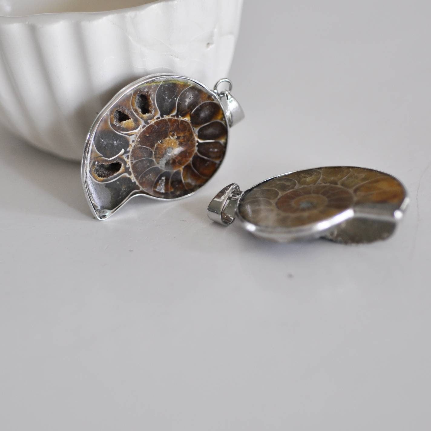 EP Silver Pendant Natural Brown Fossil Shell, Stone Pendant, Silver Pendant, Natural Shell, Shell Jewelry, Silver, 45mm