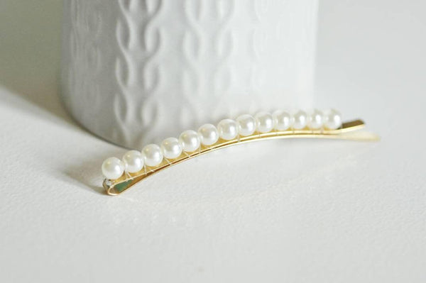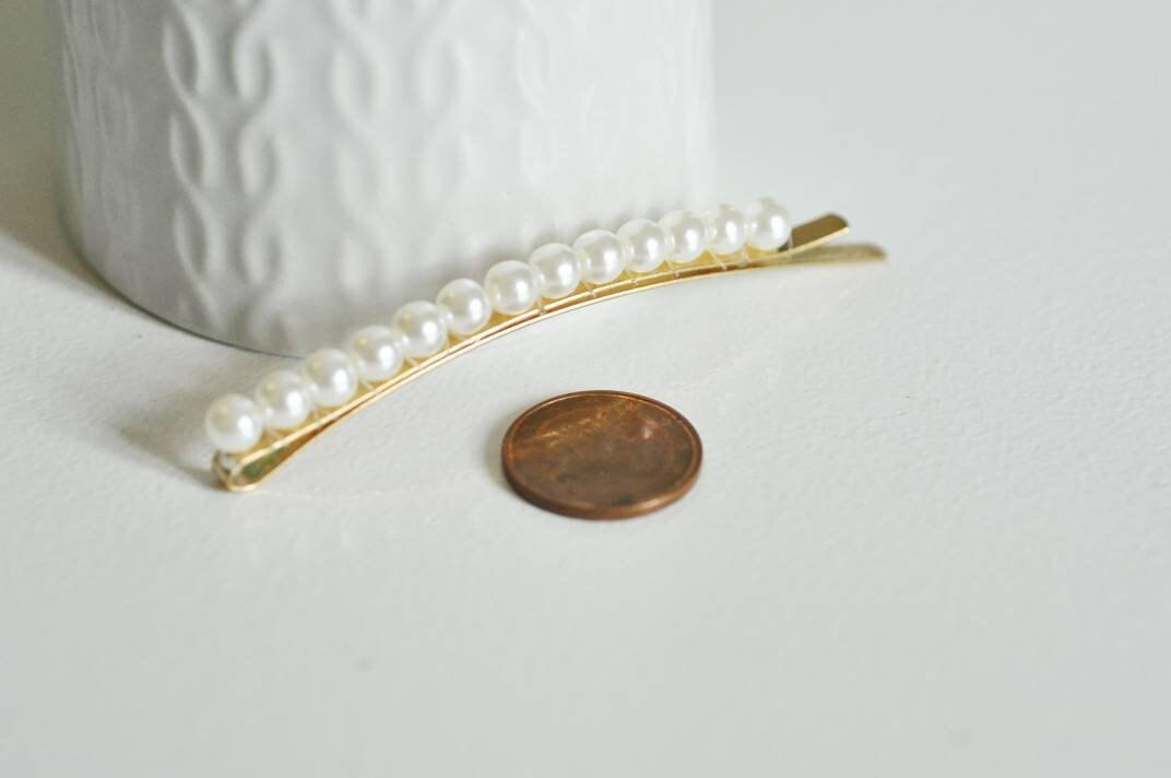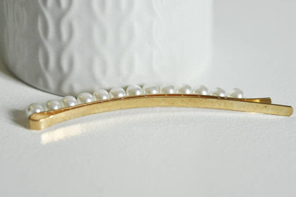 Un pasador de metal dorado decorado con perlas (imitación) , para adoptar inmediatamente para el peinado de tu boda o para todos los días. Ancho: 15 mm Longitud de la barra: 85 mm Diámetro del soporte: 19,5 mm Metal: hierro...