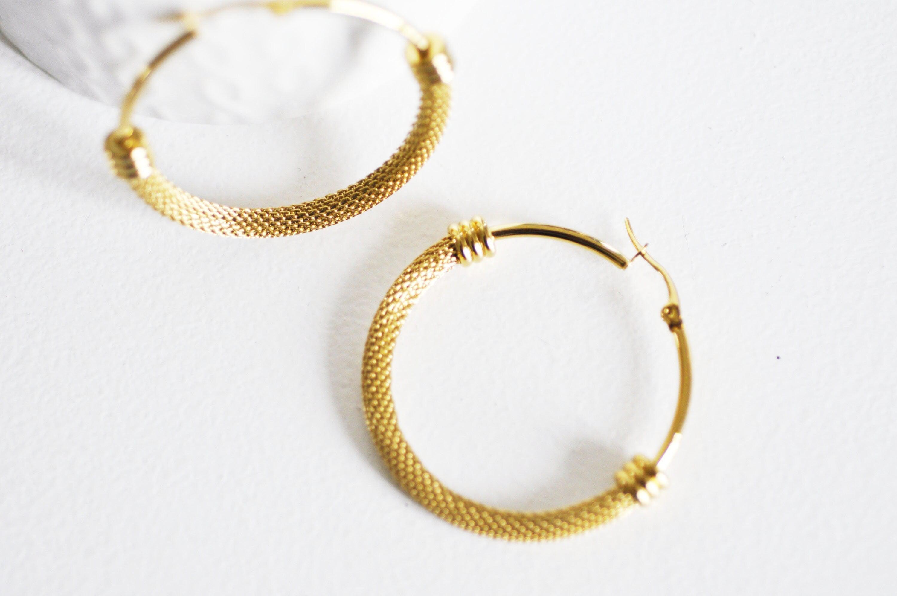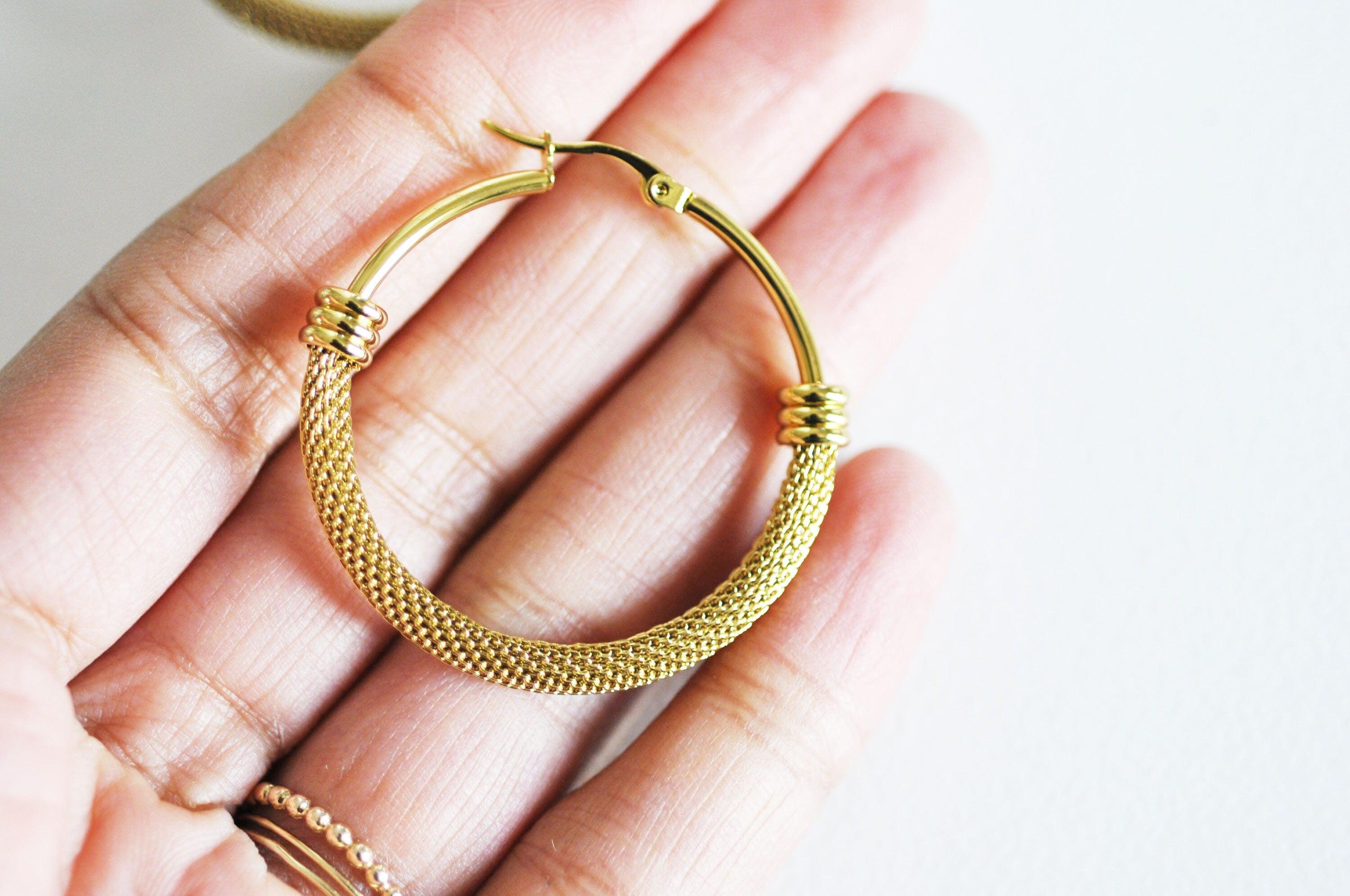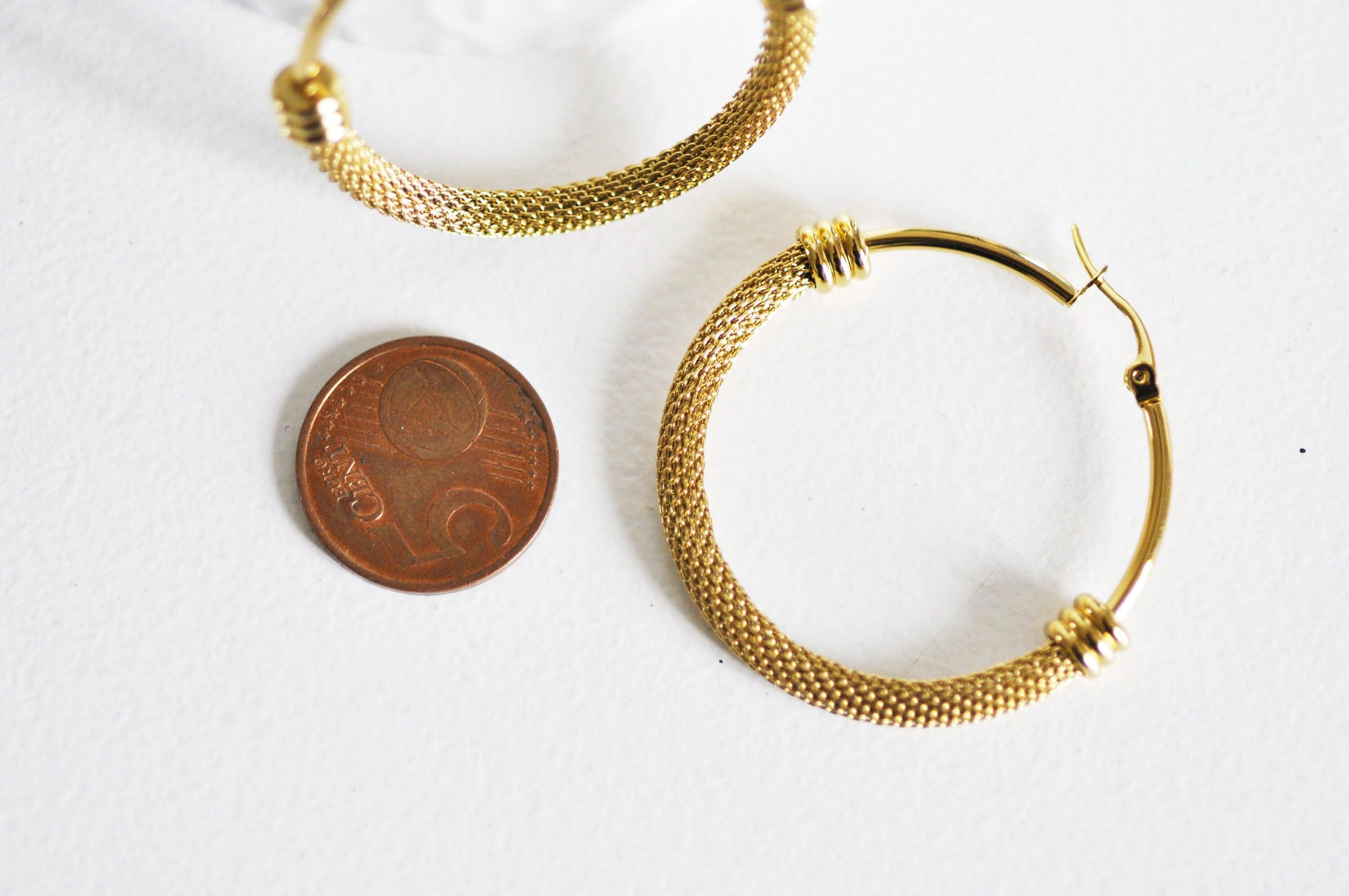 Aros de malla de acero bañados en oro, joyería bañada en oro, materiales creativos, creación de joyas, oreja perforada, sin níquel, par, pendientes de acero, 44,5 mm Pendientes de aro de acero elaborados en acero liso y malla dorada en...