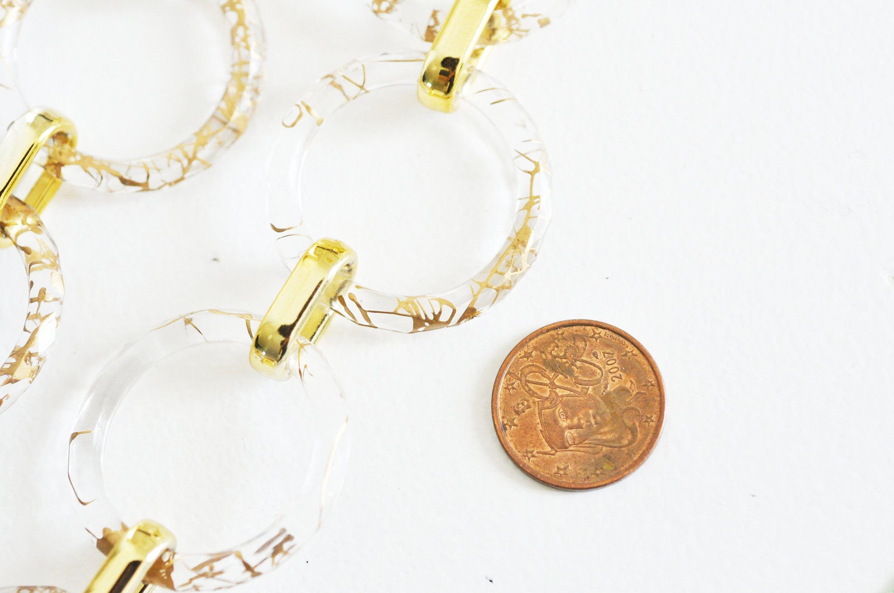 Una gran cadena de plástico acrílico transparente con un patrón dorado y un eslabón de aluminio dorado para crear joyas modernas y originales. Se entregarán en lotes de 1 metro. Un acabado original para combinar con nuestros aros de acero...