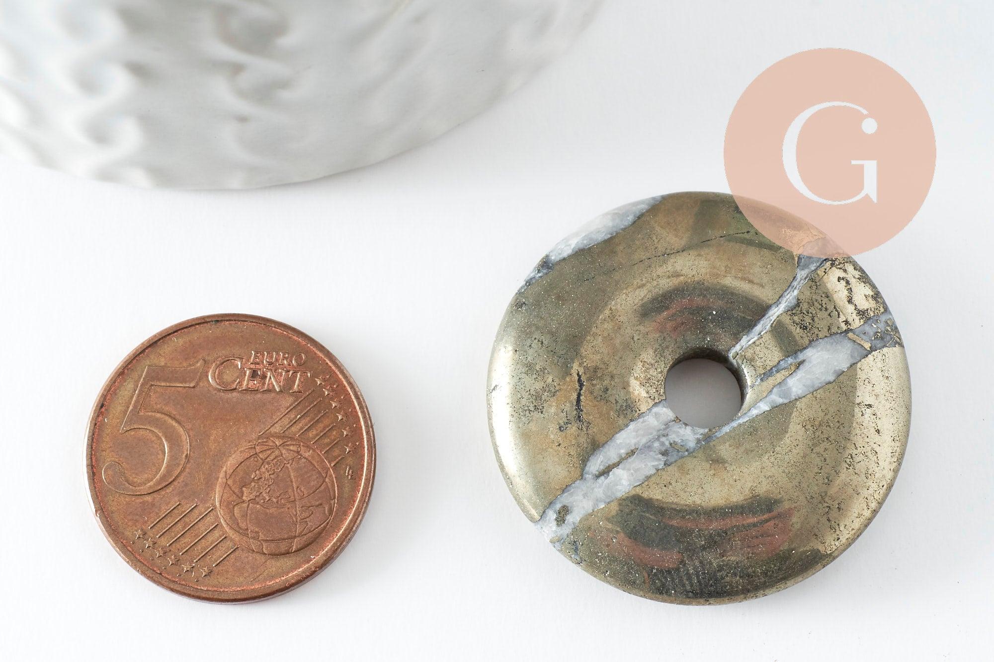 Este impresionante colgante de pirita gris natural en forma de donut encantará a los amantes de la joyería mineral elegante y sin refinar. Su superficie pulida resalta los característicos reflejos metálicos de la pirita, a veces llamada "oro de los tontos".