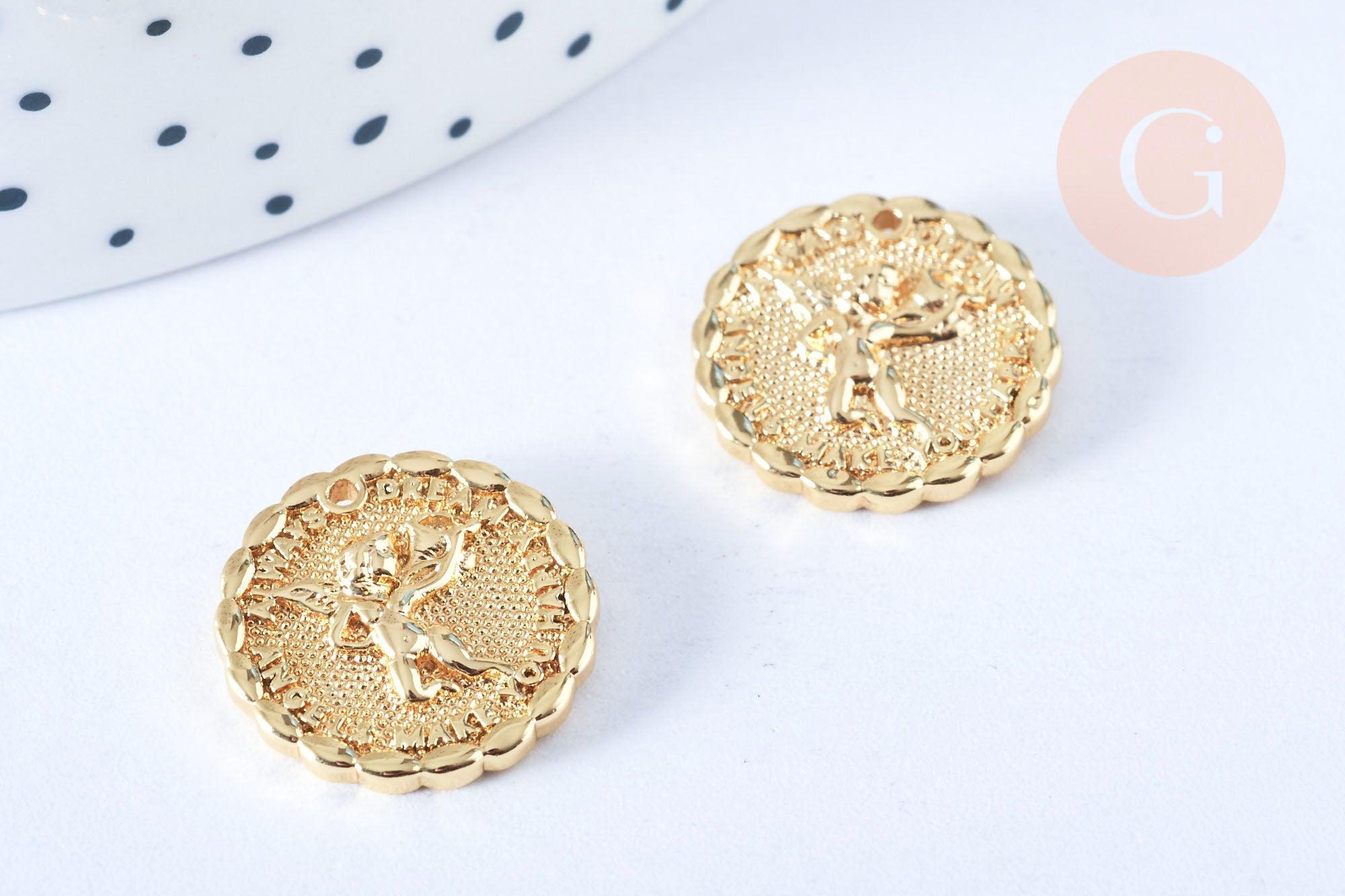 Para crear collares y pendientes con la tendencia del ángel protector, adopta esta medalla redonda de latón bañada en oro de 18 quilates decorada con un querubín.