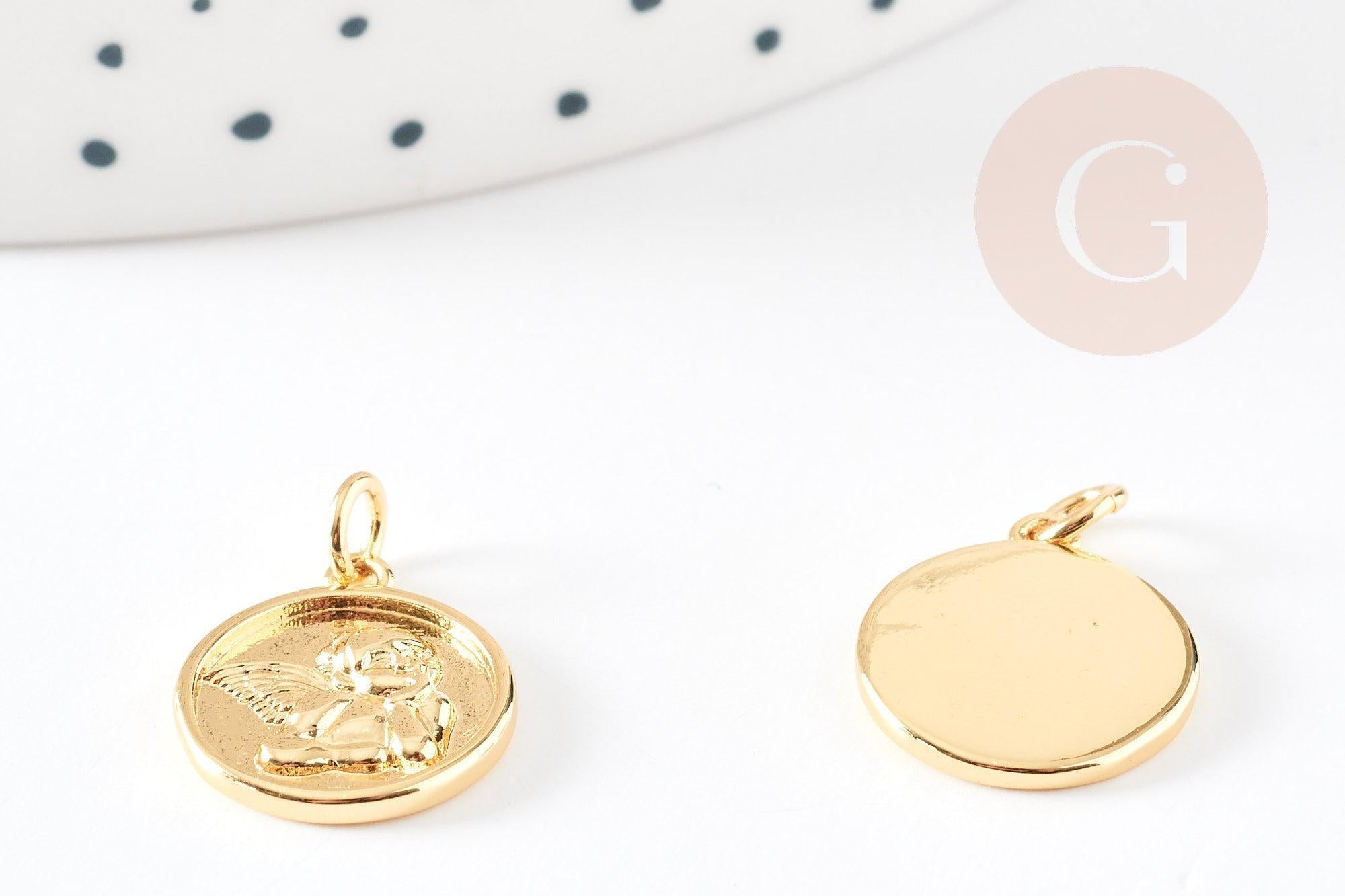 Déjate seducir por este colgante de medalla redonda de latón bañado en oro de 18 quilates delicadamente grabado con un ángel . Un colgante elegante y refinado, ideal para crear joyas personalizadas u ofrecer un regalo simbólico. Su acabado dorado lo convierte en un accesorio perfecto para creaciones refinadas, combinando suavidad y espiritualidad.