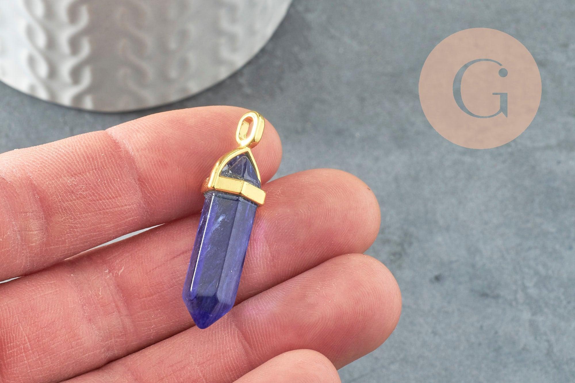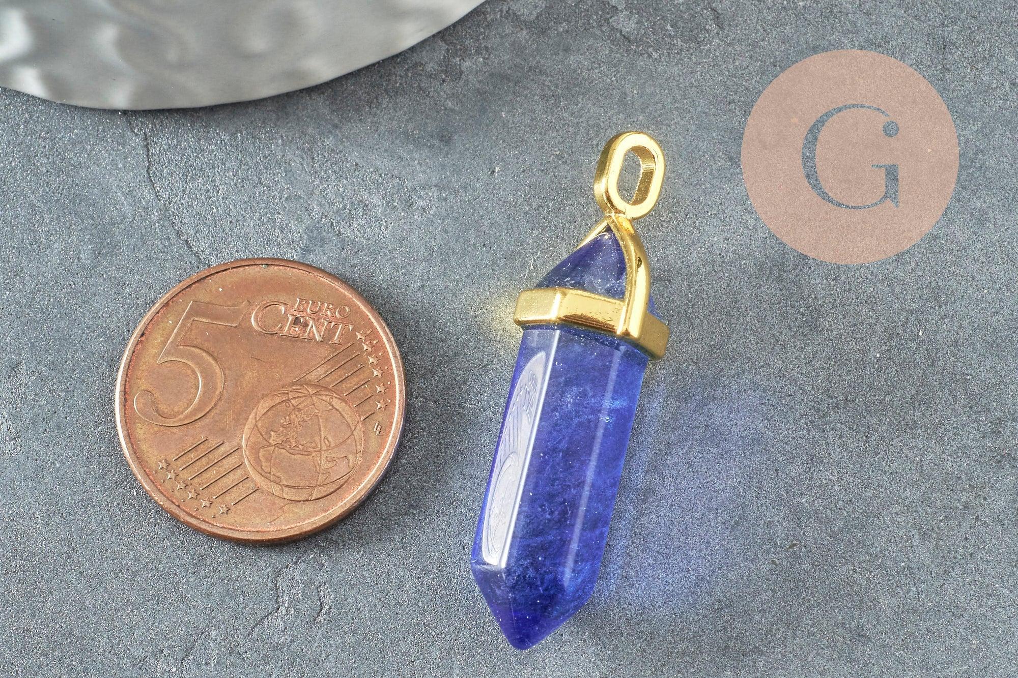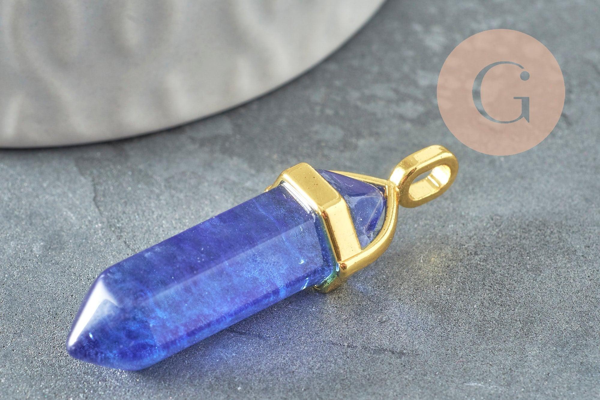Déjese seducir por este colgante de piedra sandía teñida de azul transparente con su soporte de zamac dorado.