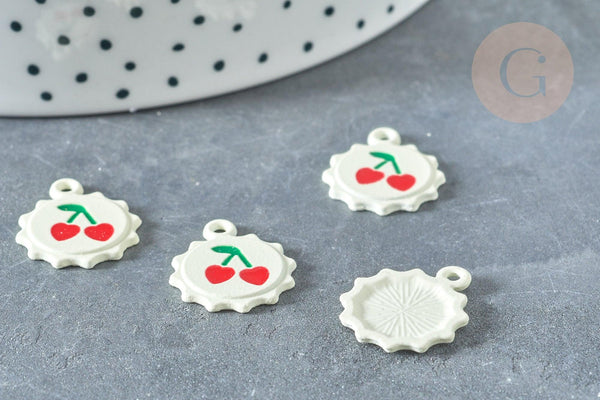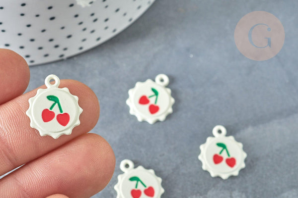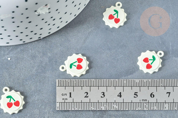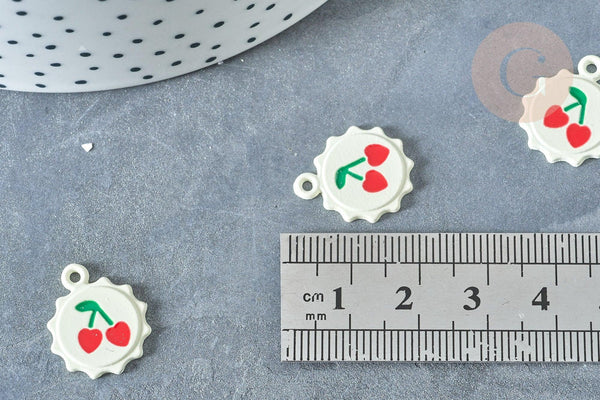 Déjate seducir por este colgante que representa un sol, esmaltado en blanco y su cereza, con clip en la parte superior, ideal para realizar tu bisutería DIY .