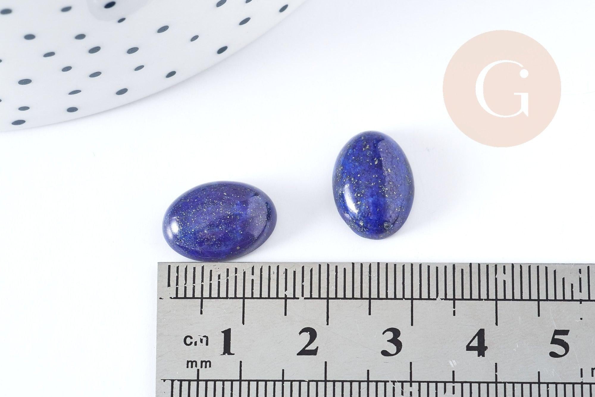 - Este cabujón de lapislázuli natural , de forma ovalada (14x10 mm) , muestra un magnífico tono azul profundo salpicado de finas inclusiones doradas de pirita, características de esta piedra preciosa.