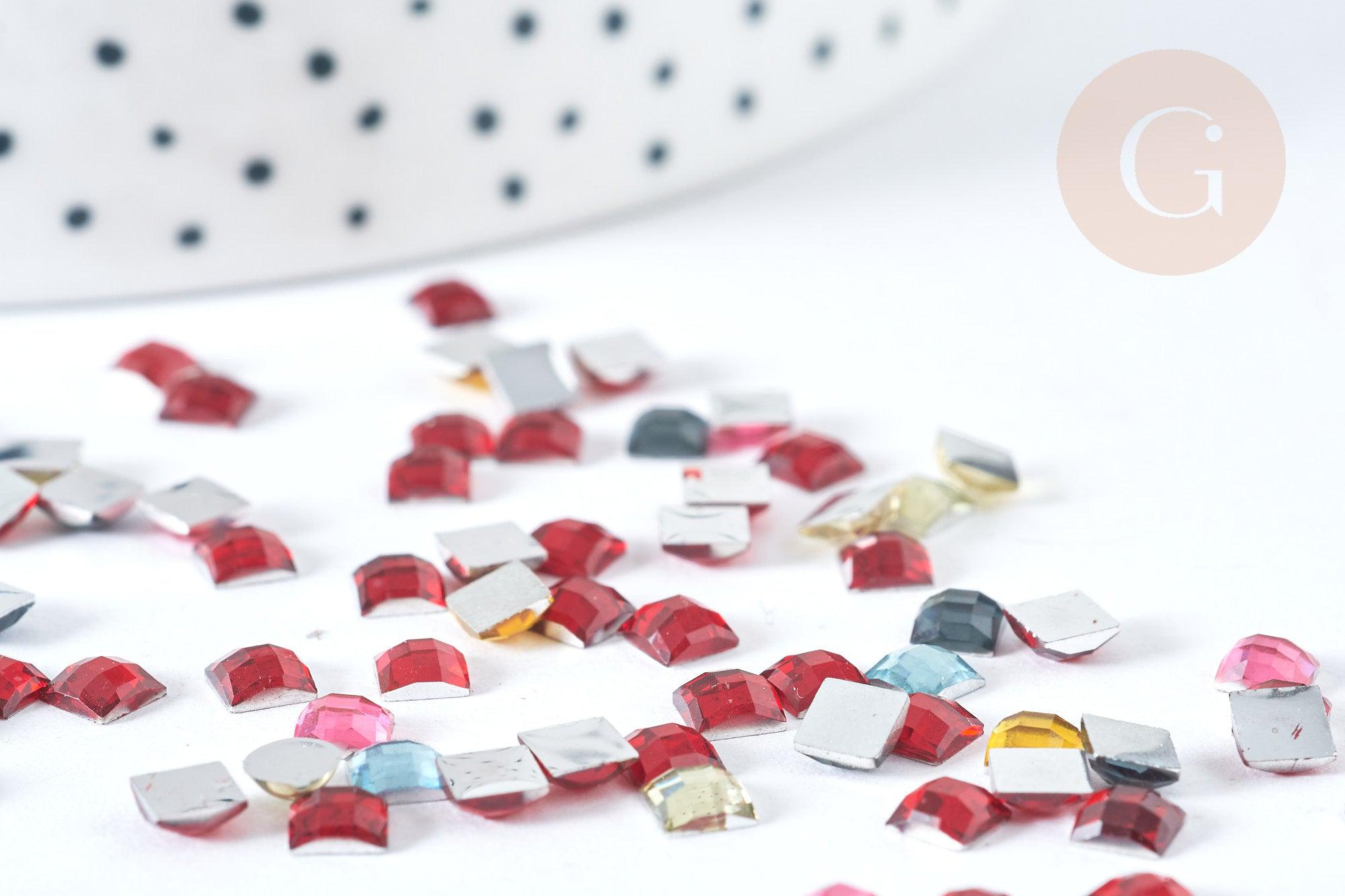 Exprese su creatividad y personalice su ropa y accesorios en textil o cuero suave con este juego de 5 gramos de cabujones cuadrados de plástico multicolor con diamantes de imitación.