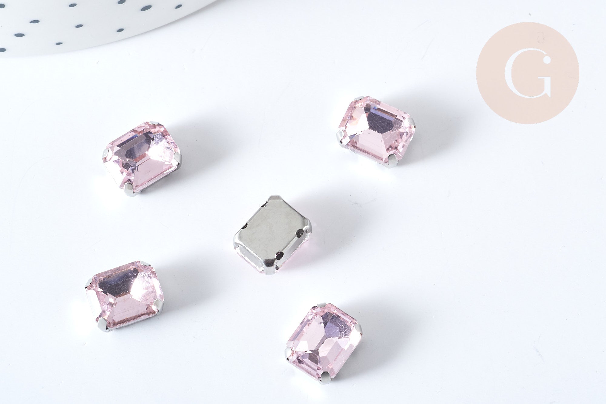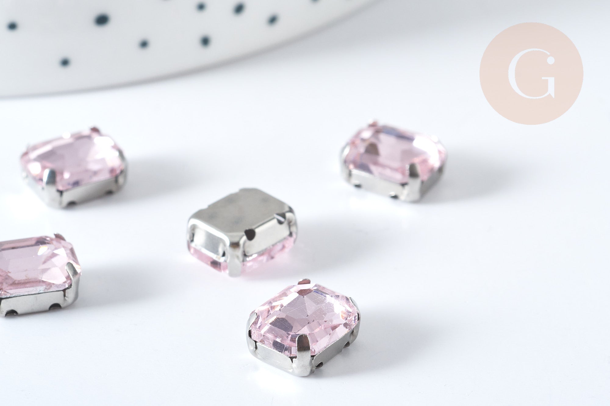 Cabujón rectangular de cristal rosa claro con montura de latón plateado, 8x10 mm, x5 (G8114)