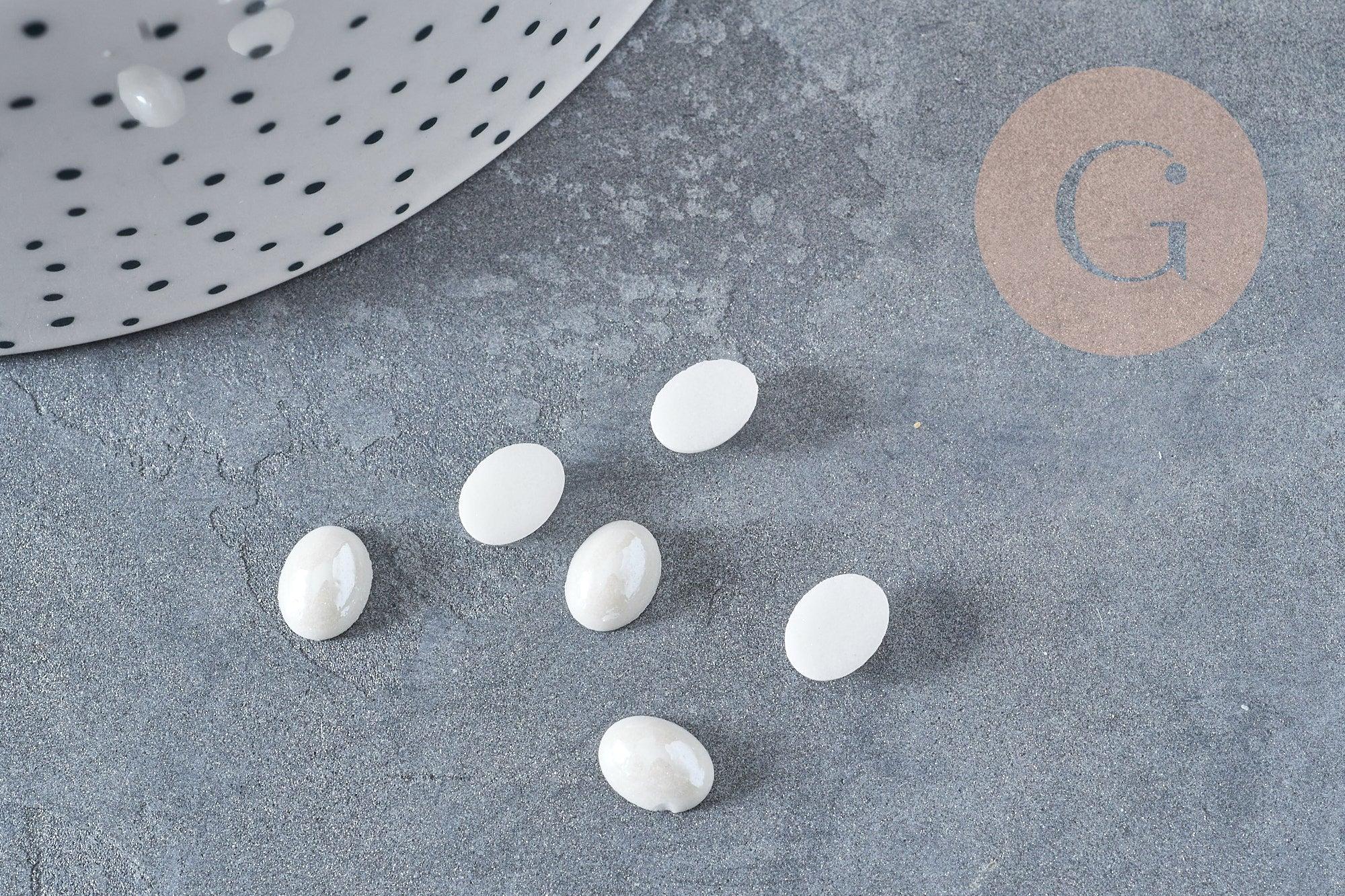 Gracias a su exclusivo acabado blanco iridiscente, estos cabujones ovalados en forma de cúpula pueden añadir un toque de sofisticación y glamour a cualquier proyecto de joyería o personalización.