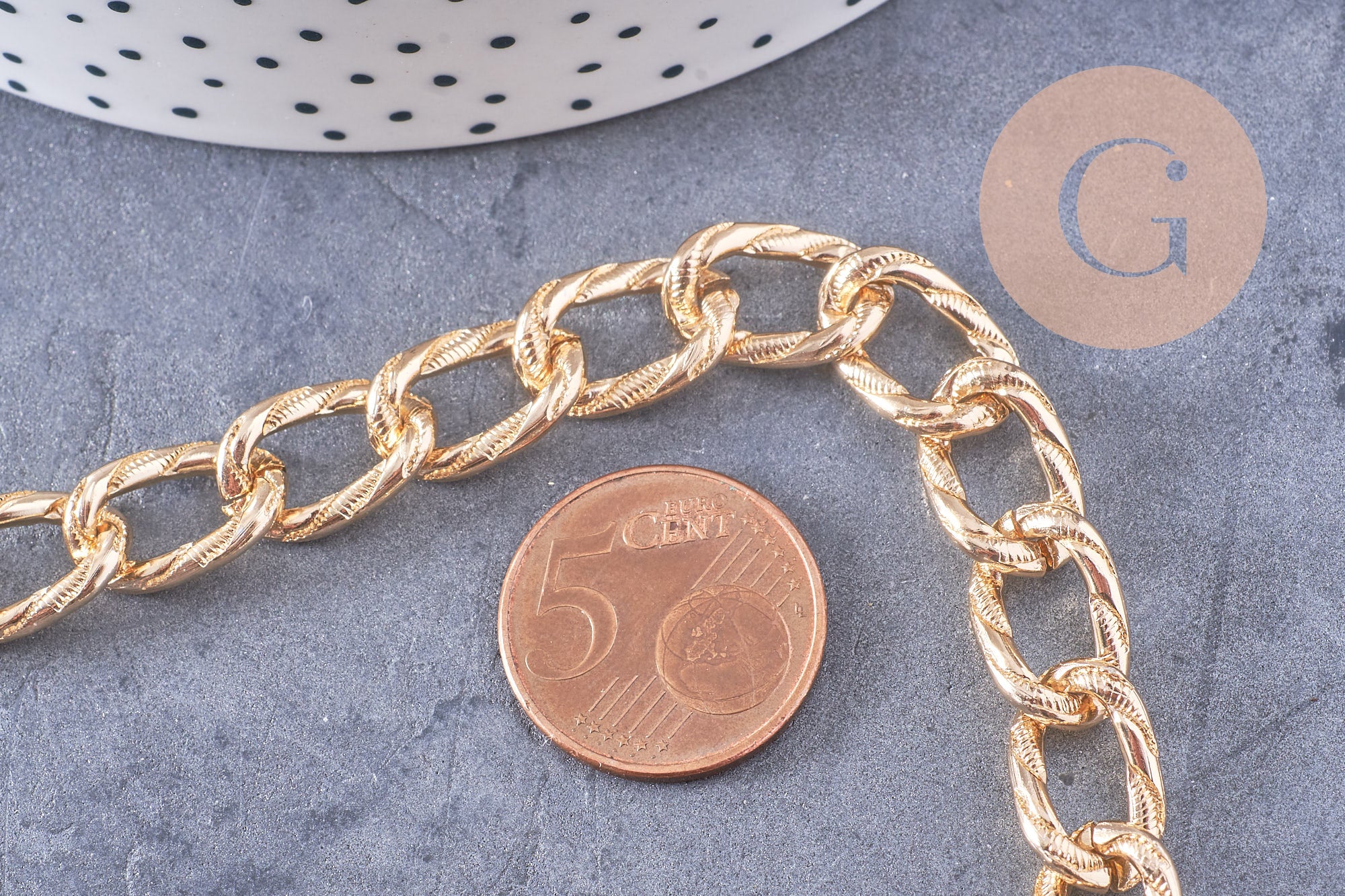 Dale un toque atrevido y moderno a tus diseños con esta gruesa cadena de eslabones ovalados con textura en aluminio dorado . Con sus grandes eslabones de 15 mm , es perfecta para crear piezas llamativas como collares voluminosos, pulseras extragrandes o pendientes modernos.