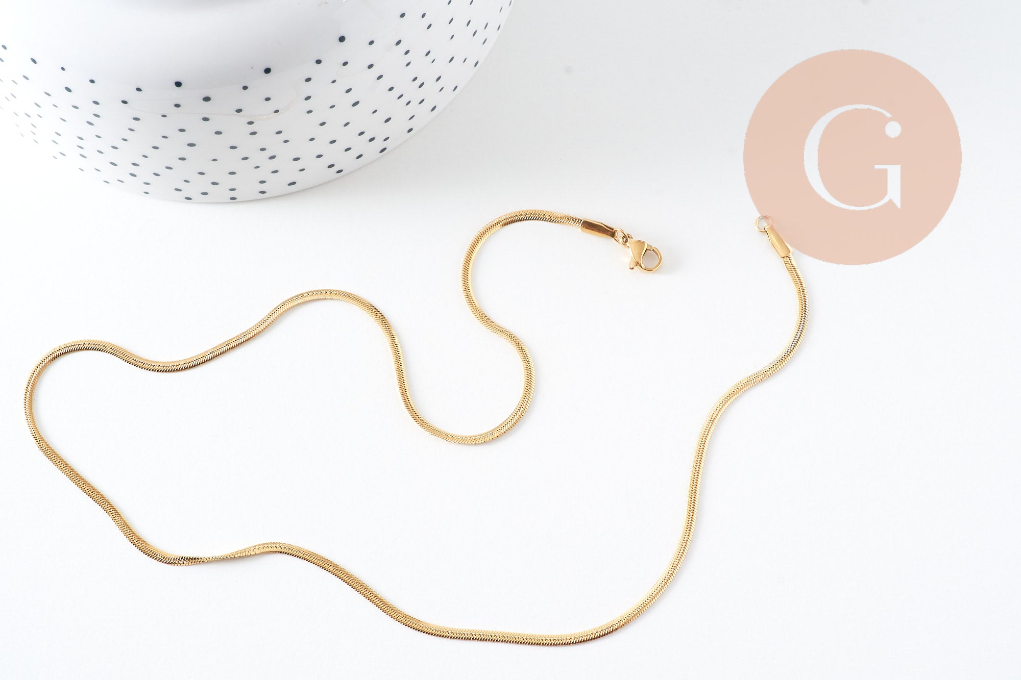 Con un grosor de 2,2 mm y una longitud de 45 cm, esta cadena de serpiente completa es fácil de usar e integrar en tus creaciones de joyería.
