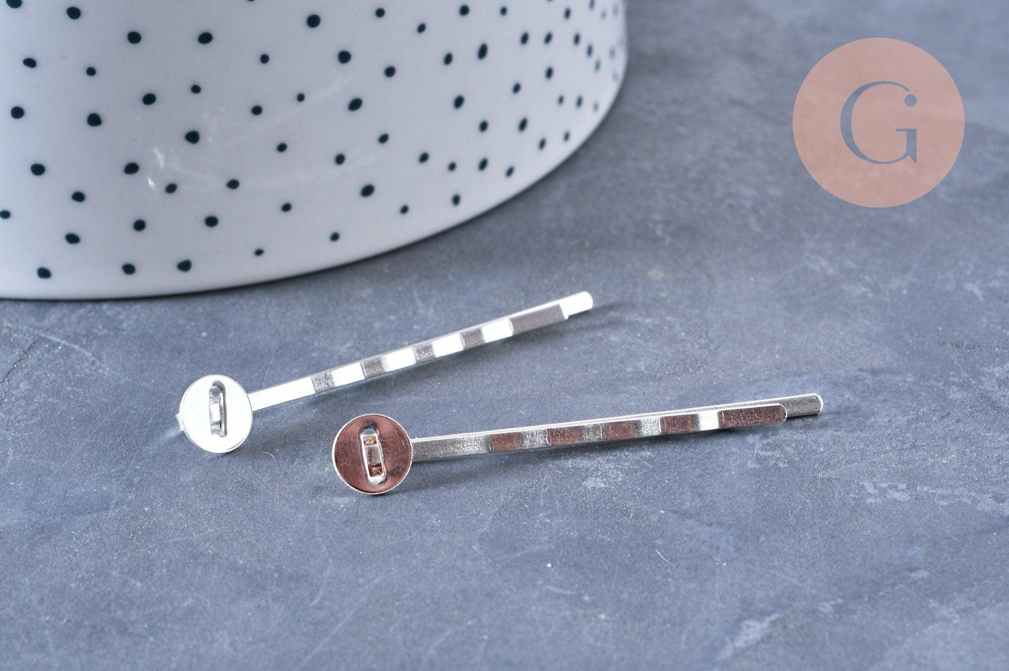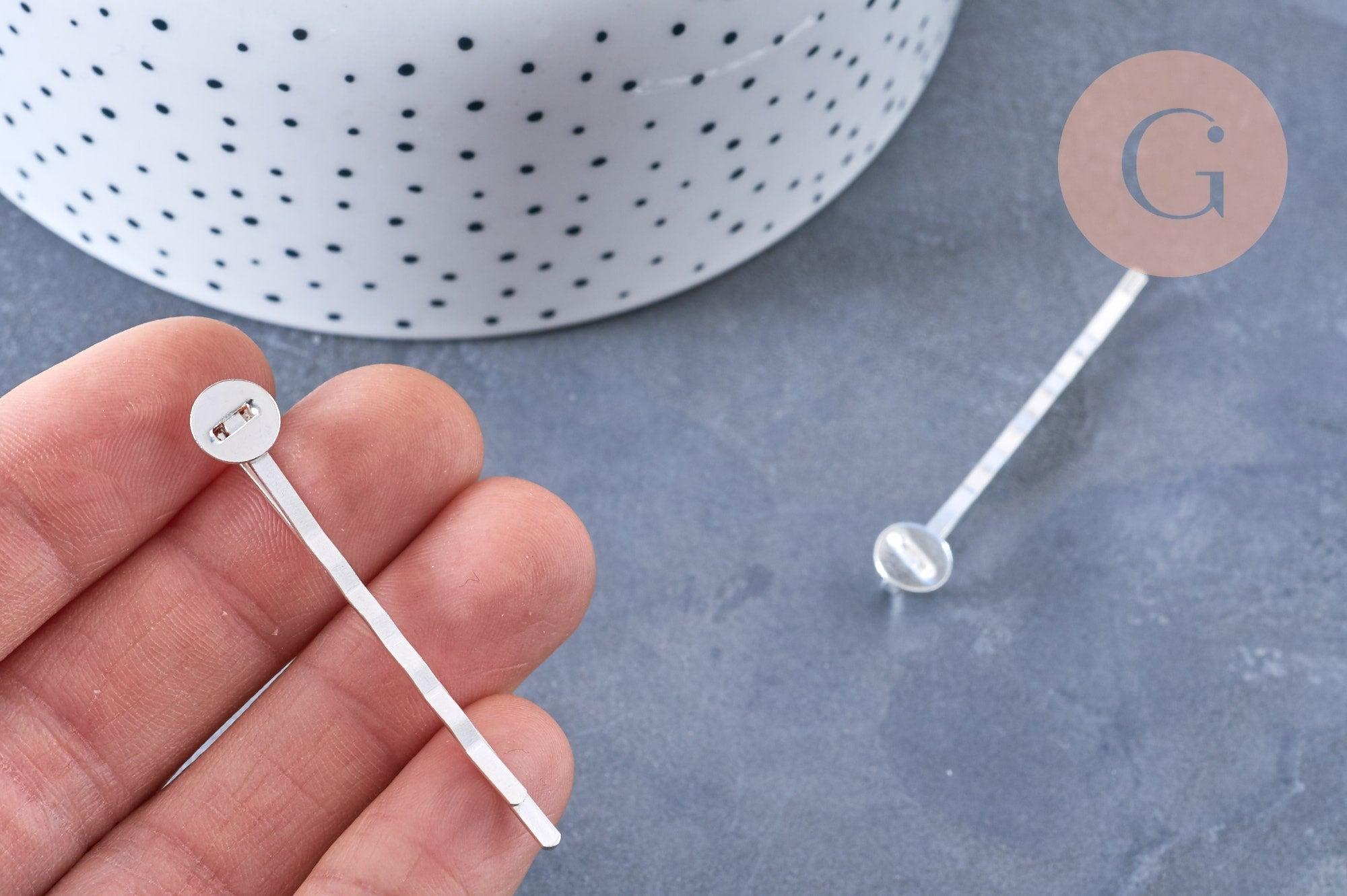 Este soporte para pasador de metal plateado con bandeja es ideal para crear tus propias joyas para el cabello. Haga que esta joya sea única añadiendo perlas de colores, piedras preciosas o pedrería.