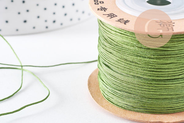 Este cordón de poliéster trenzado verde caqui de 0,6 mm es perfecto para tus proyectos de joyería, macramé o costura creativa. Fino y resistente, es ideal para crear pulseras, collares y dijes, o para anudar cuentas y colgantes.