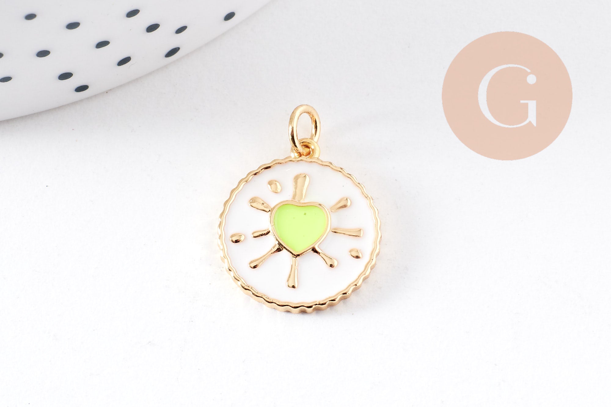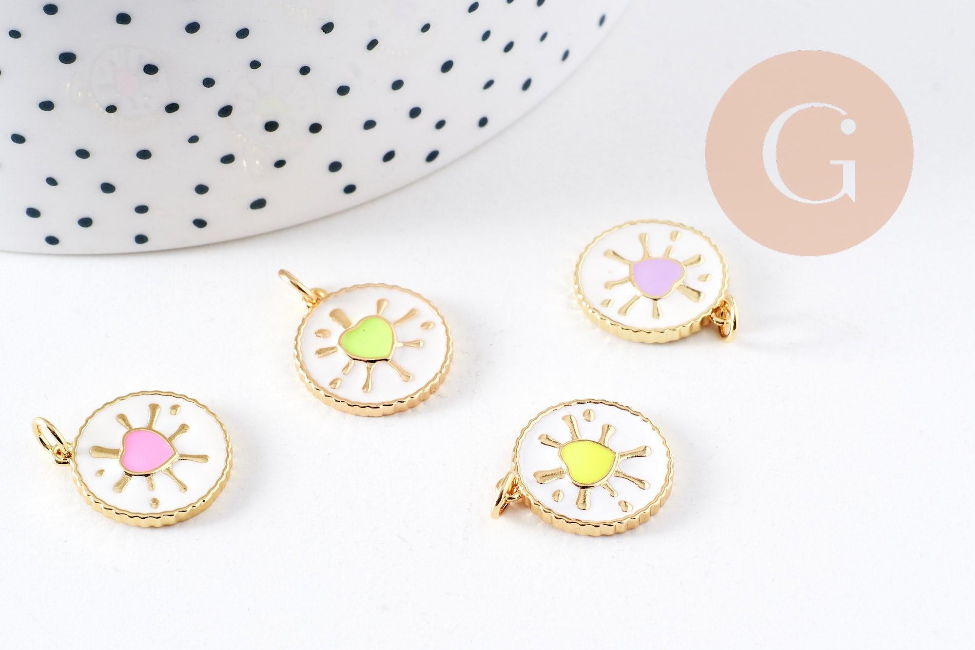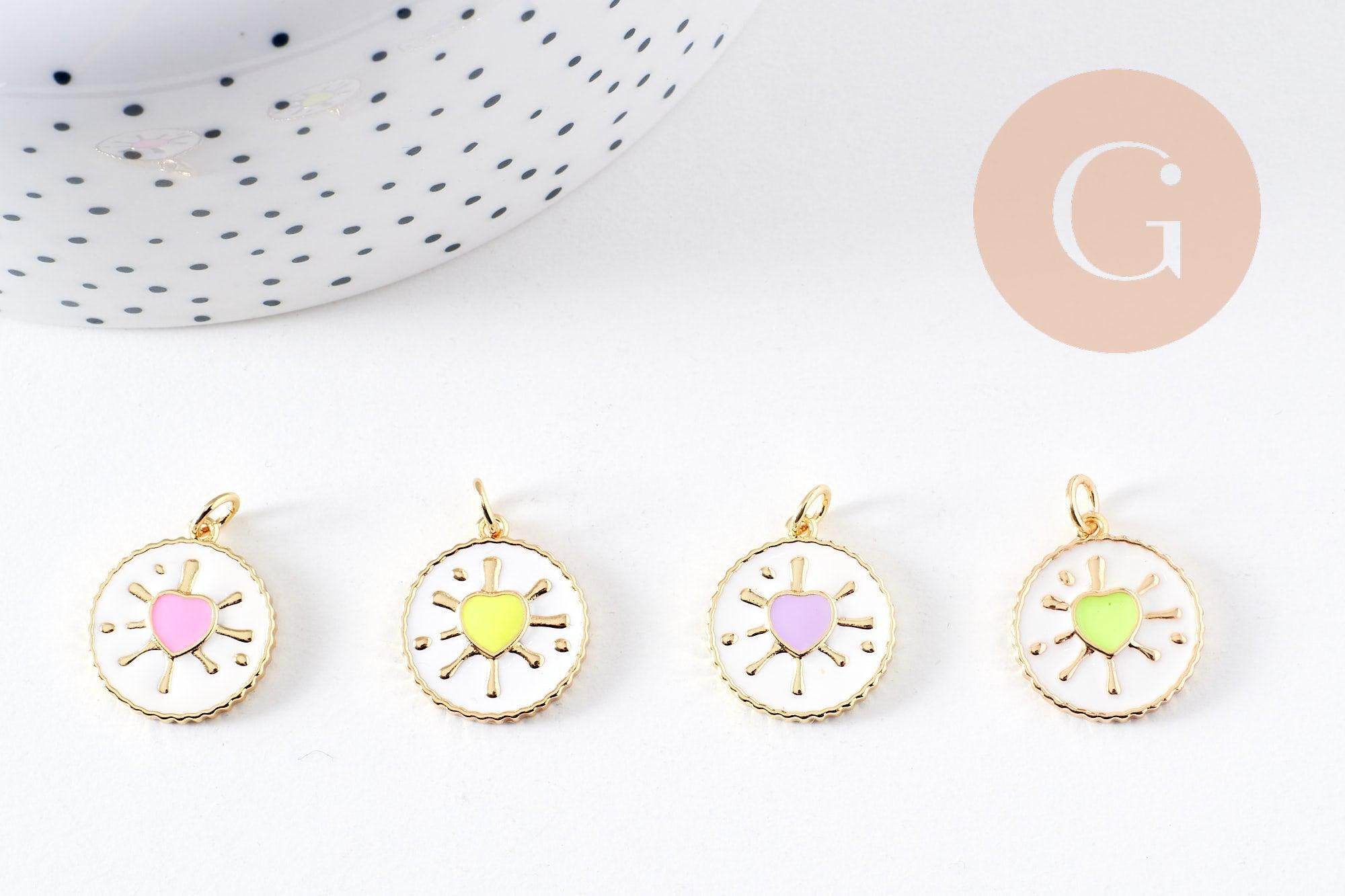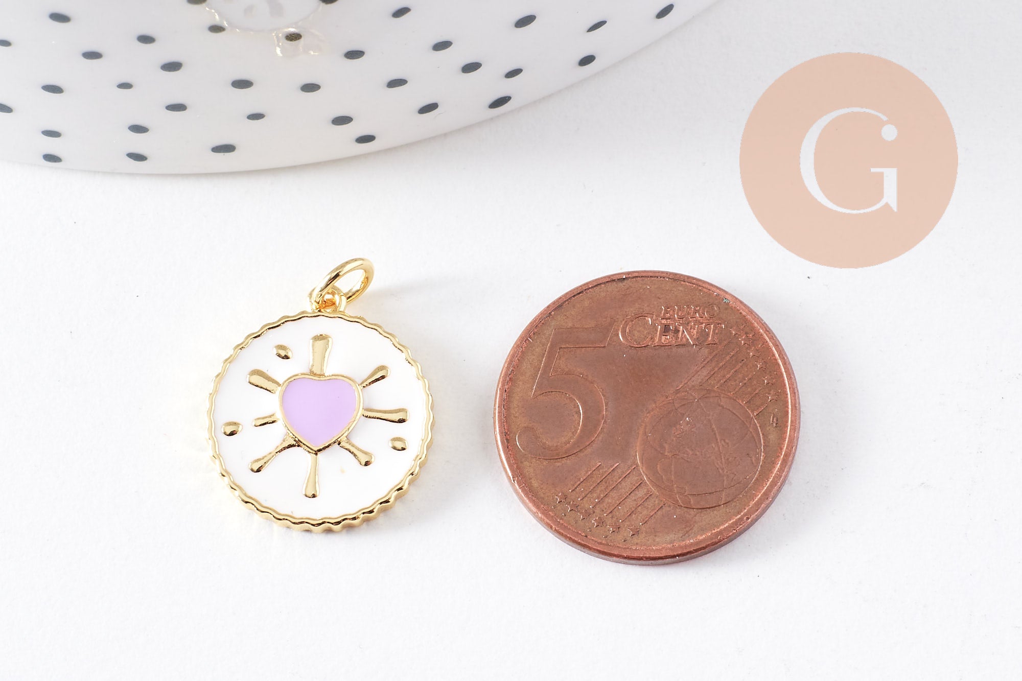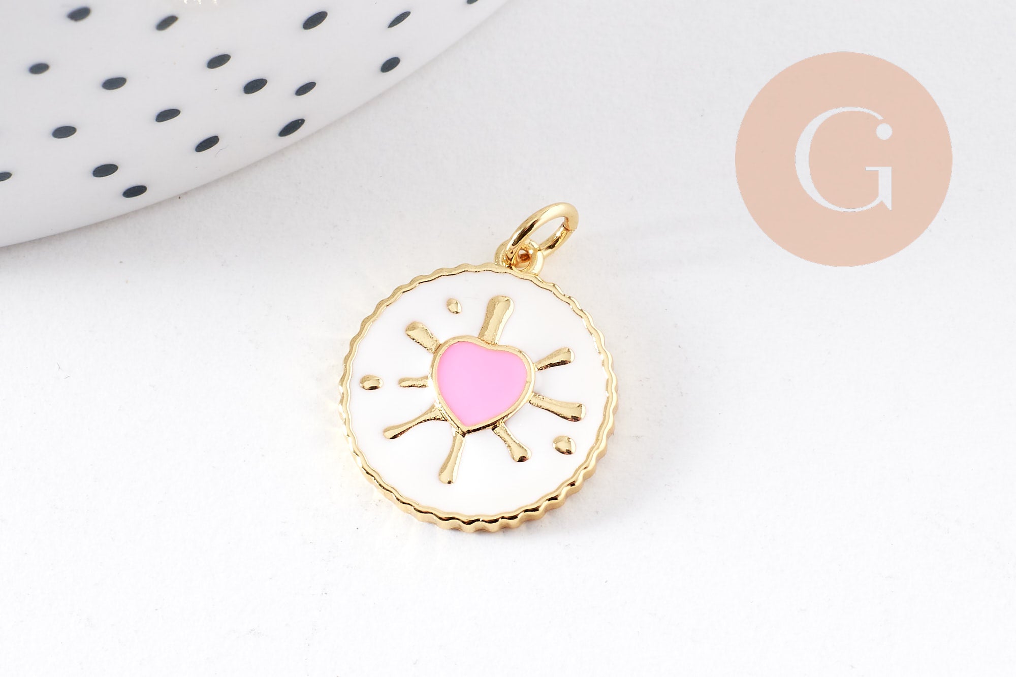 Colgante medalla corazón redondo esmalte rosa latón bañado en oro 18K 18mm, colgante corazón latón, sin níquel, x1 (G8420)