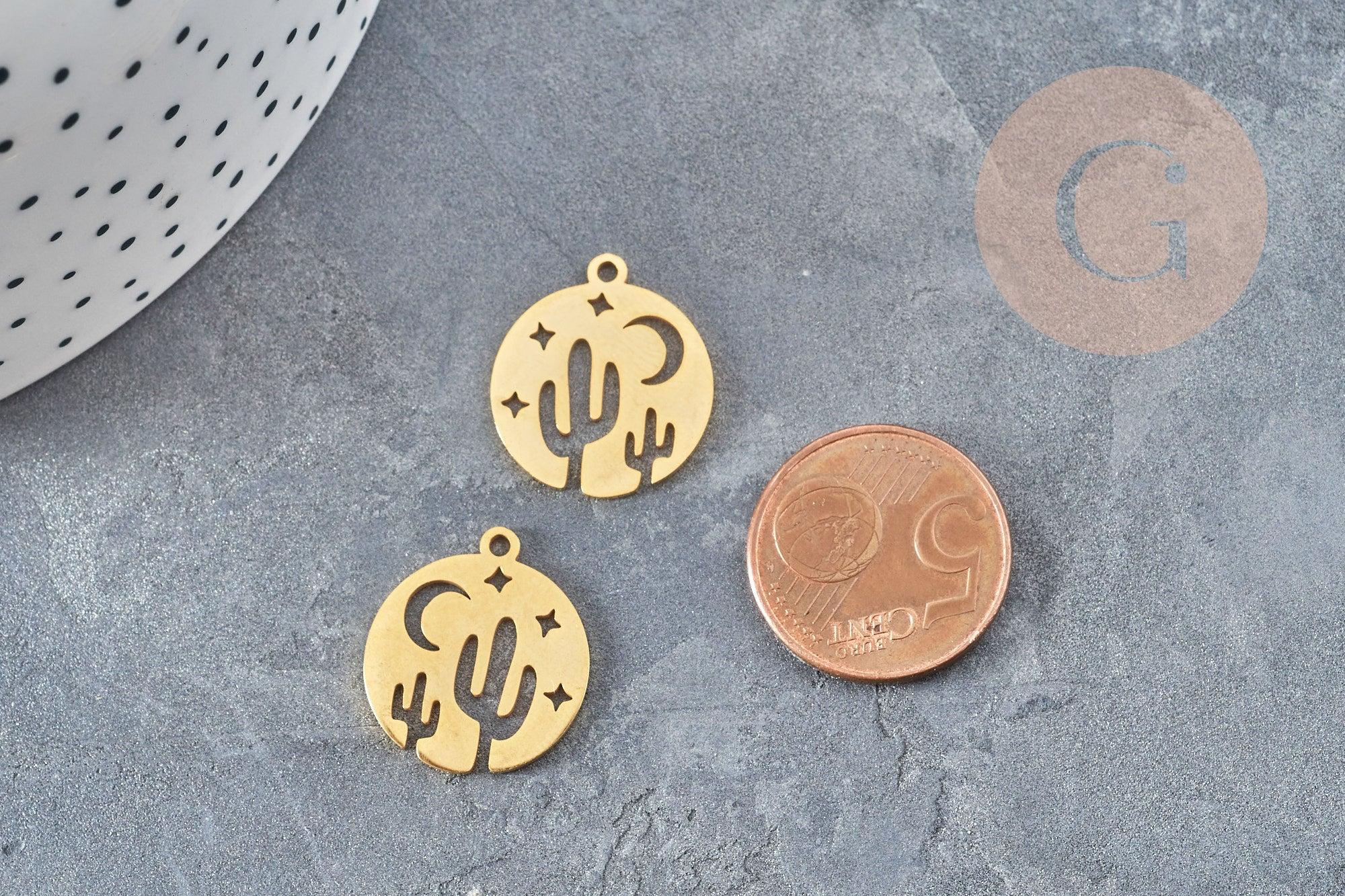 Pendentif médaille cactus étoiles acier doré 20.5mm, breloque acier inoxydable doré x1 (G6038)