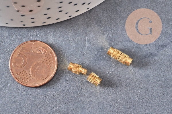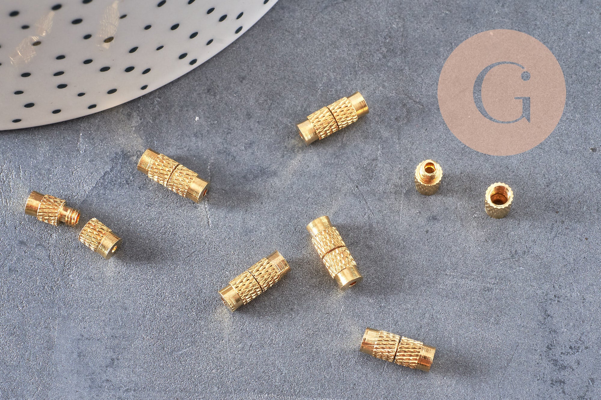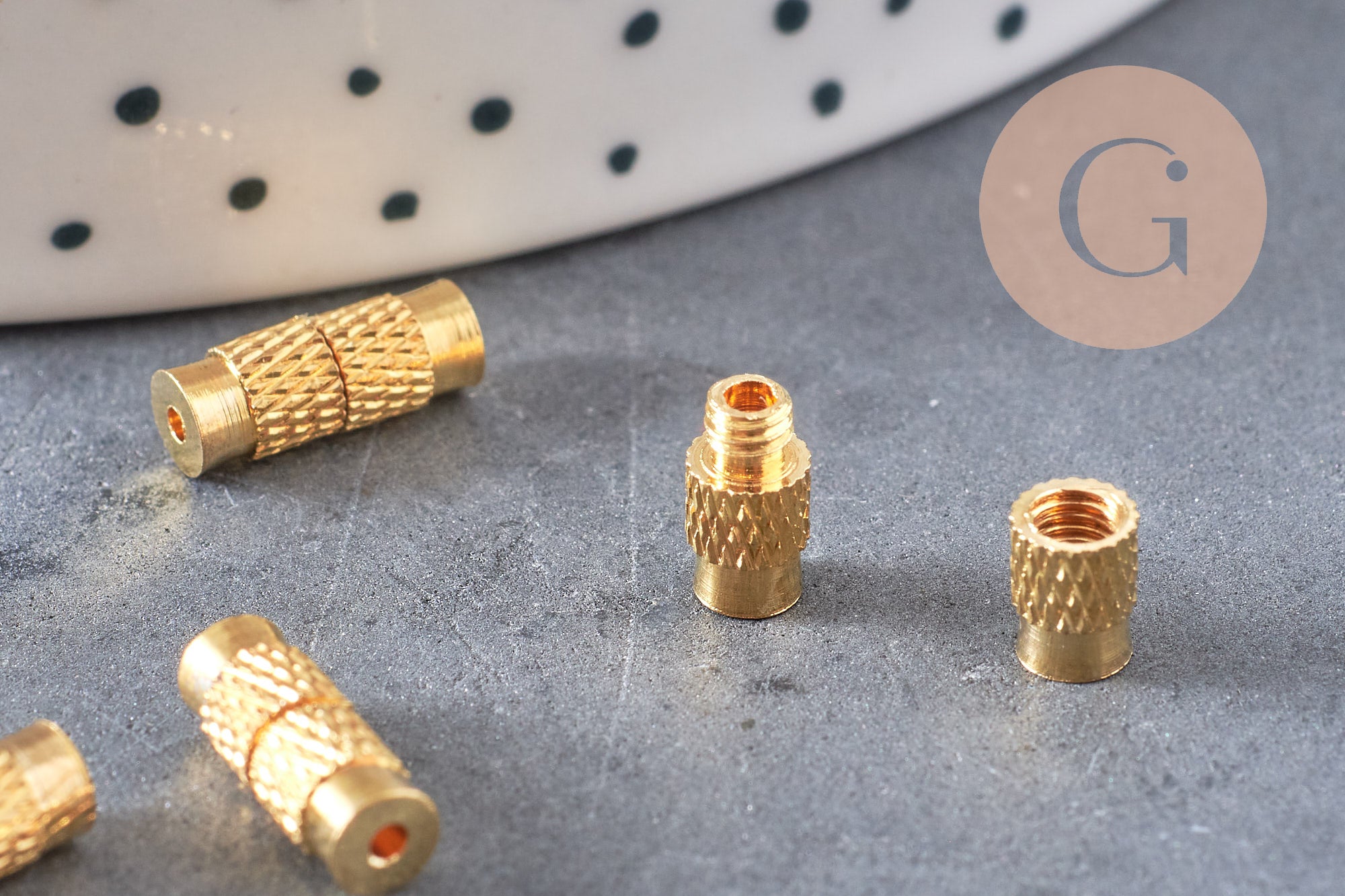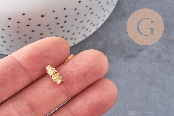 Dale un acabado profesional y elegante a tus creaciones con estos cierres de rosca de latón dorado texturizado. Resistentes y elegantes, son perfectos para asegurar tus collares, pulseras y collares largos.