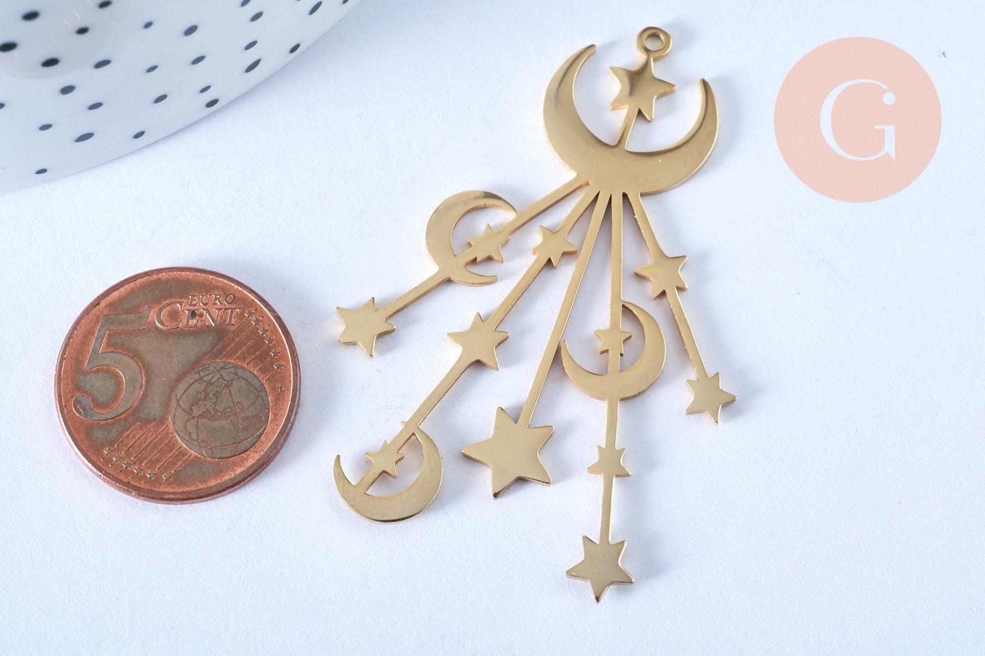 Pendentif acier doré lunes et étoiles 53mm, breloque doré, acier inoxydable doré, pendentif sans nickel, x1 G6385