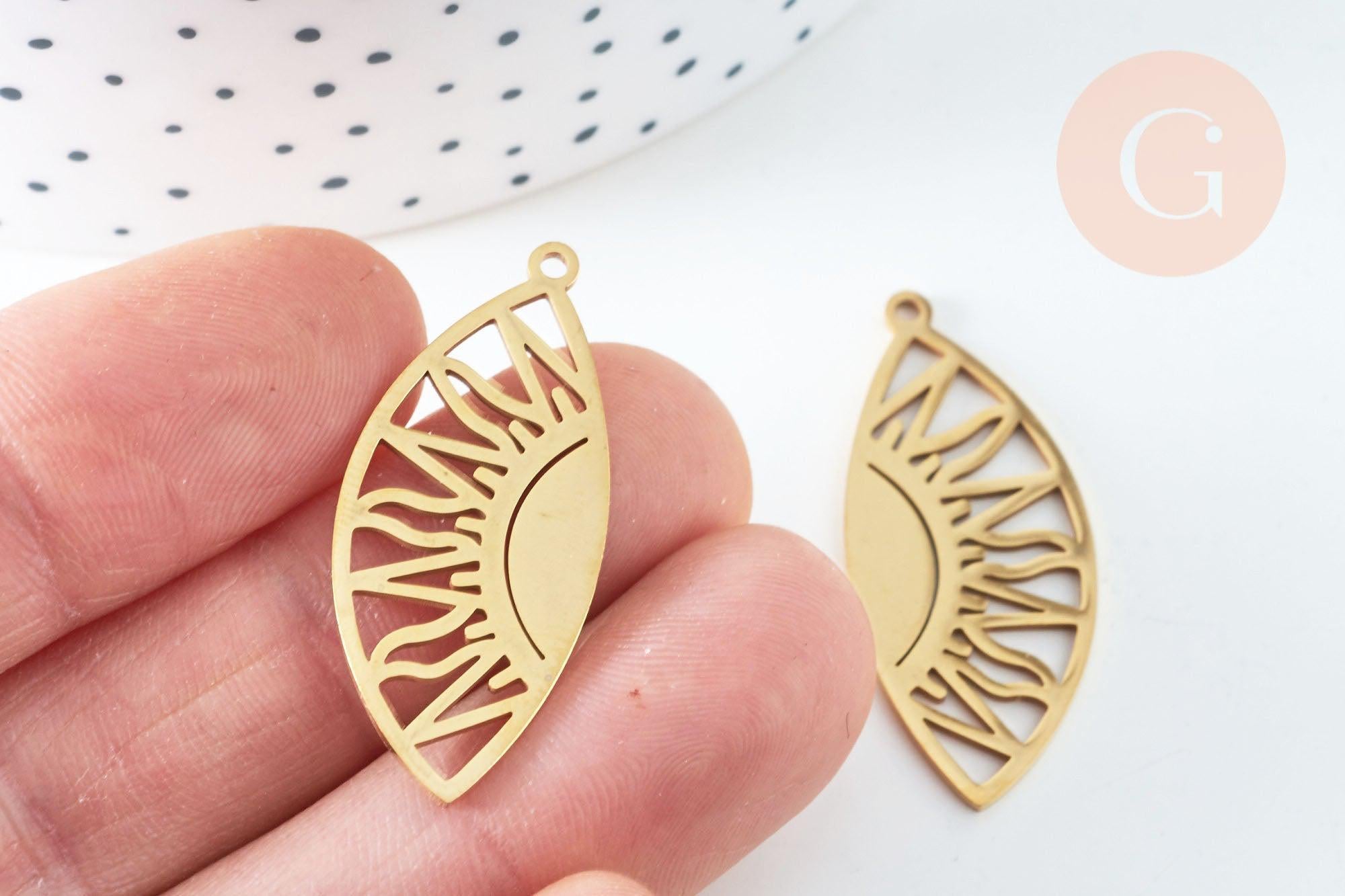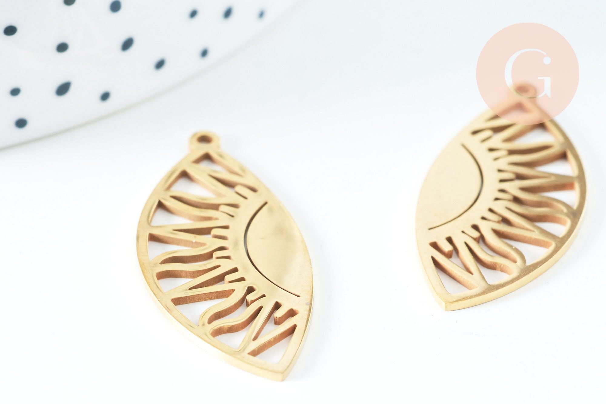 Un colgante de acero inoxidable bañado en oro en forma de gota que incorpora un sol. Un adorable colgante dorado para usar en todas tus creaciones.