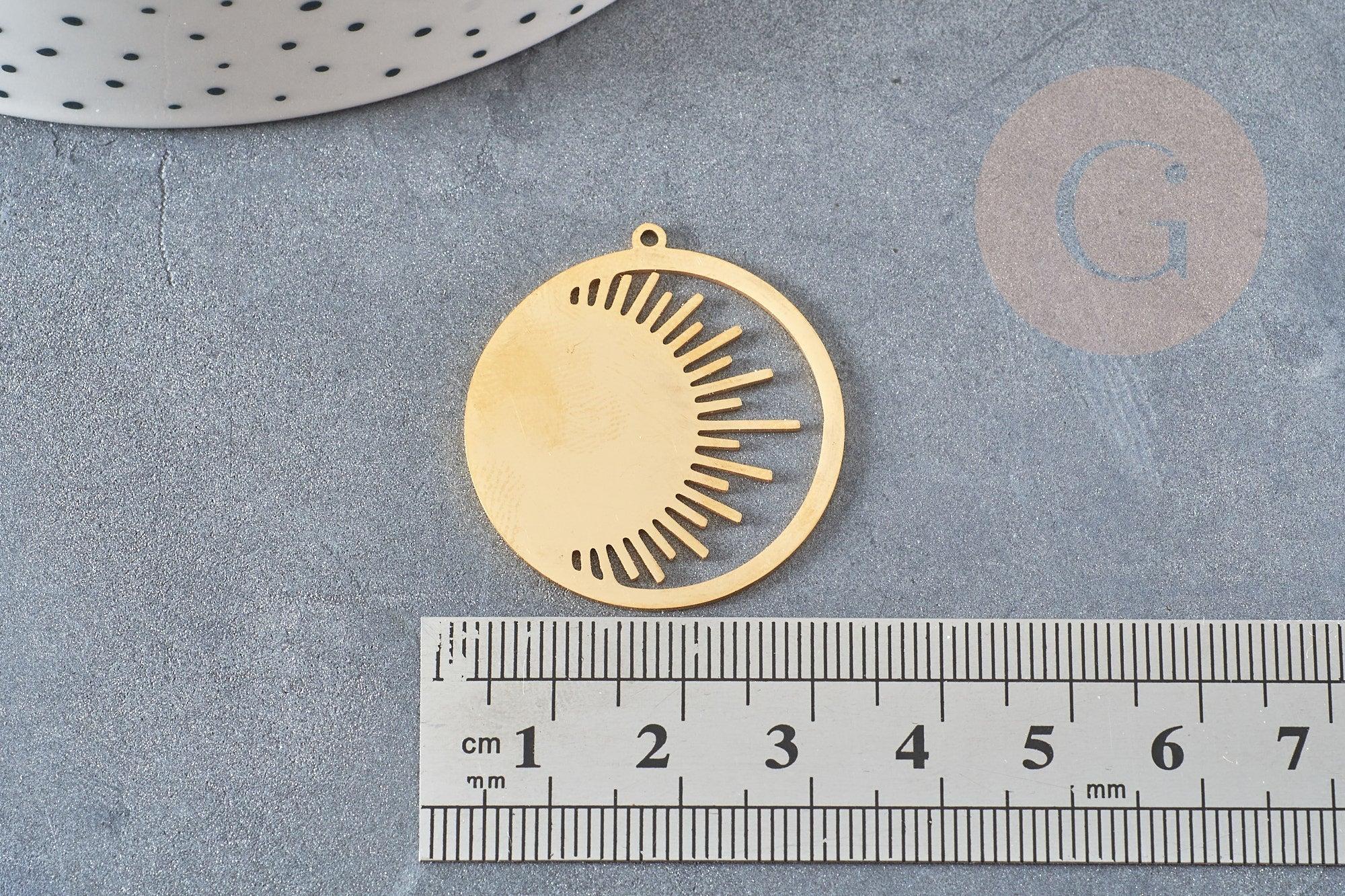 Un colgante de sol redondo en acero inoxidable dorado . Un adorable colgante dorado para usar en todas tus creaciones de aretes y collares.