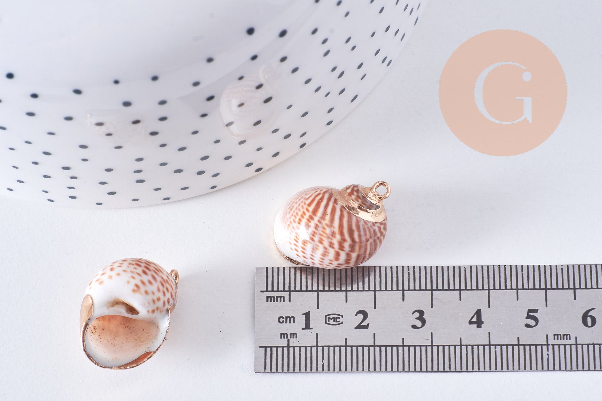 • Material: concha natural, bordes de latón dorado.
