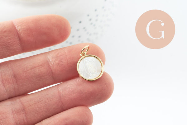 Pendentif médaille ronde vierge nacre naturelle laiton doré 16mm, x1 (G10045)