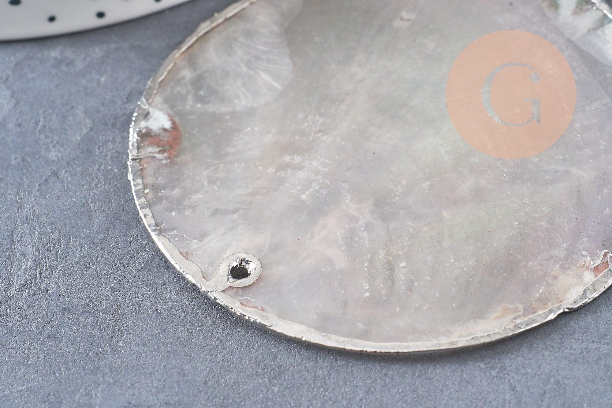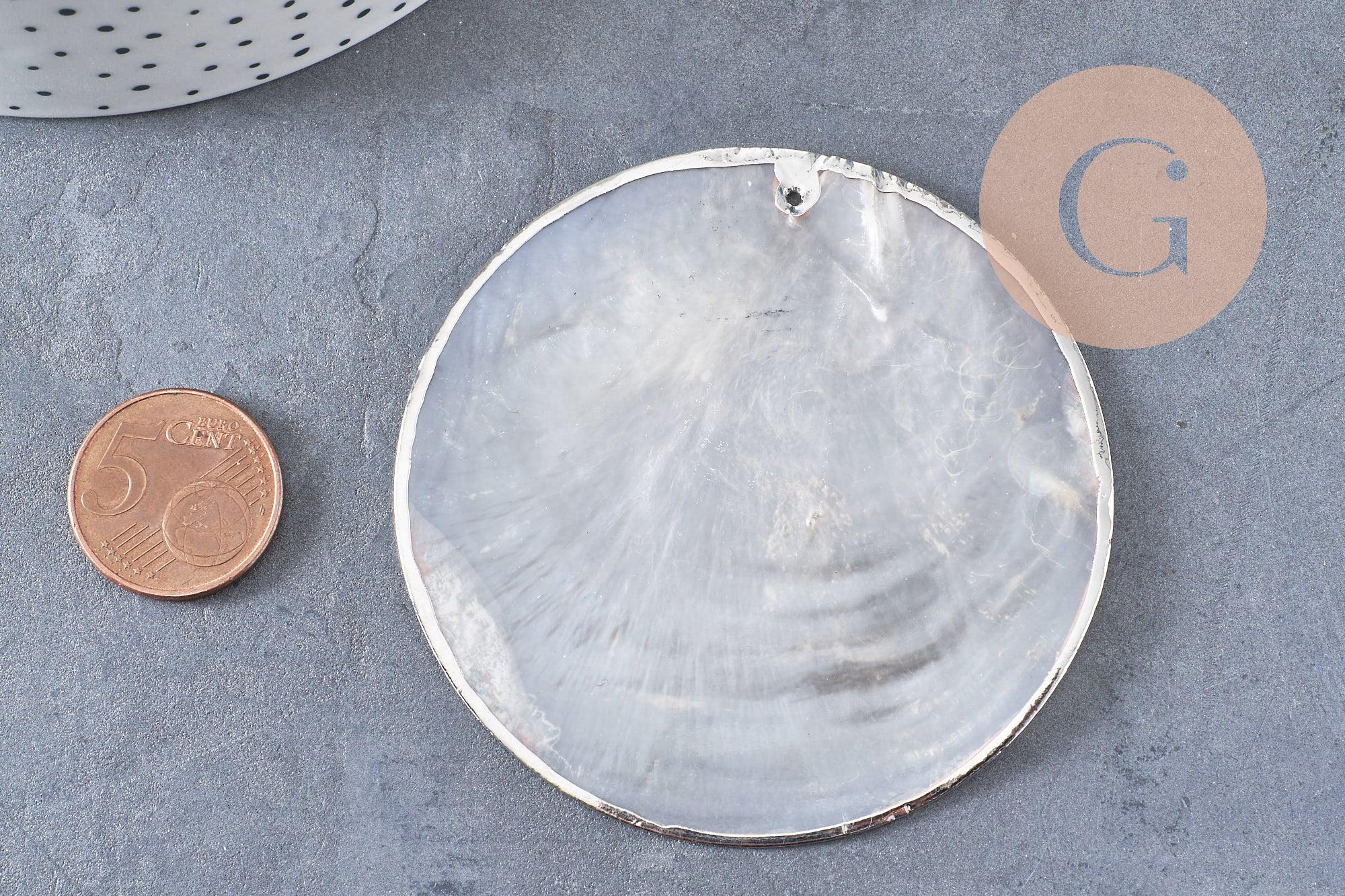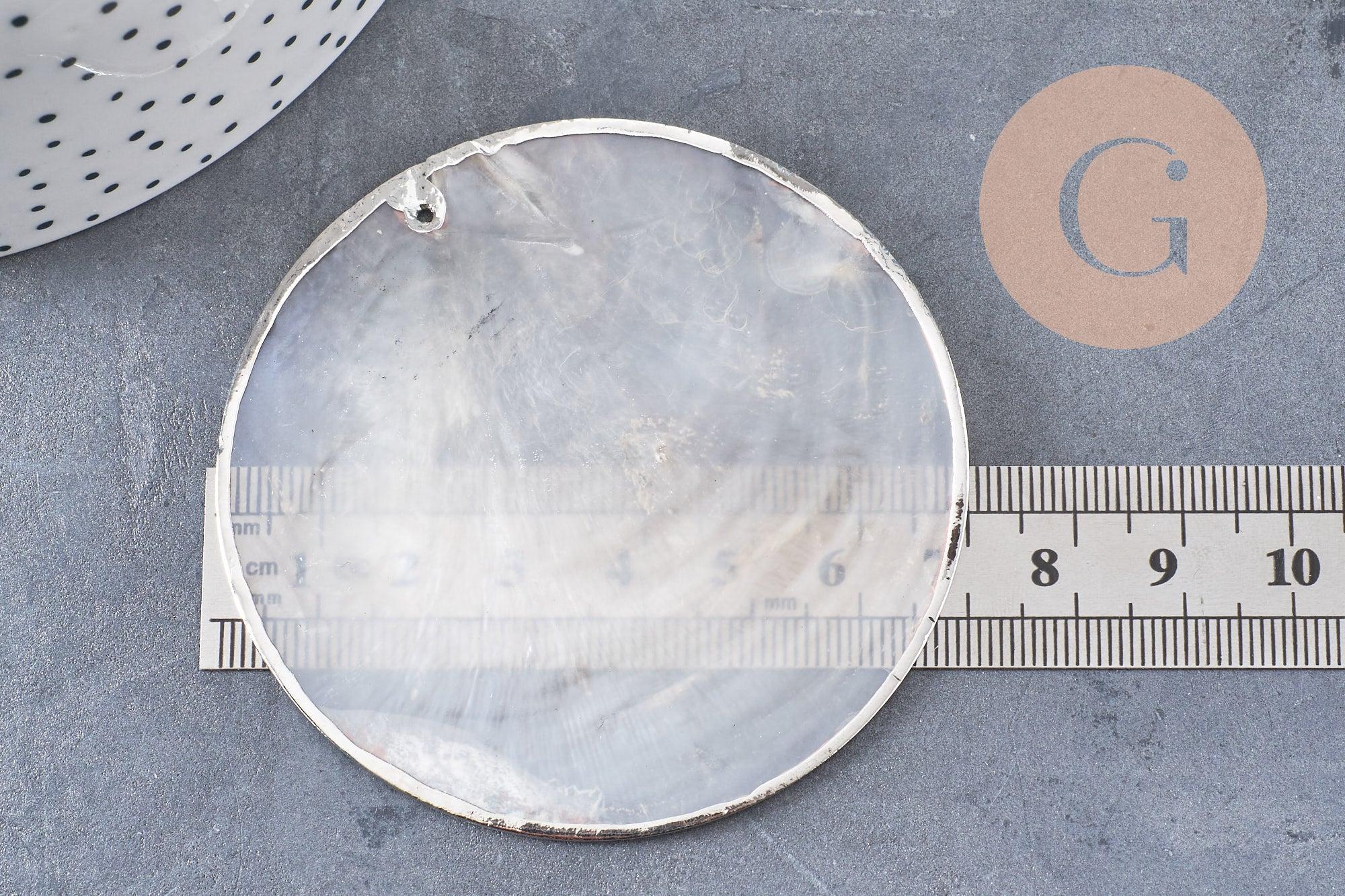 Pendentif rond nacre blanche argent, pendentif coquillage, coquillage blanc, coquillage naturel,création bijoux, 70mm, x1 (G1076)