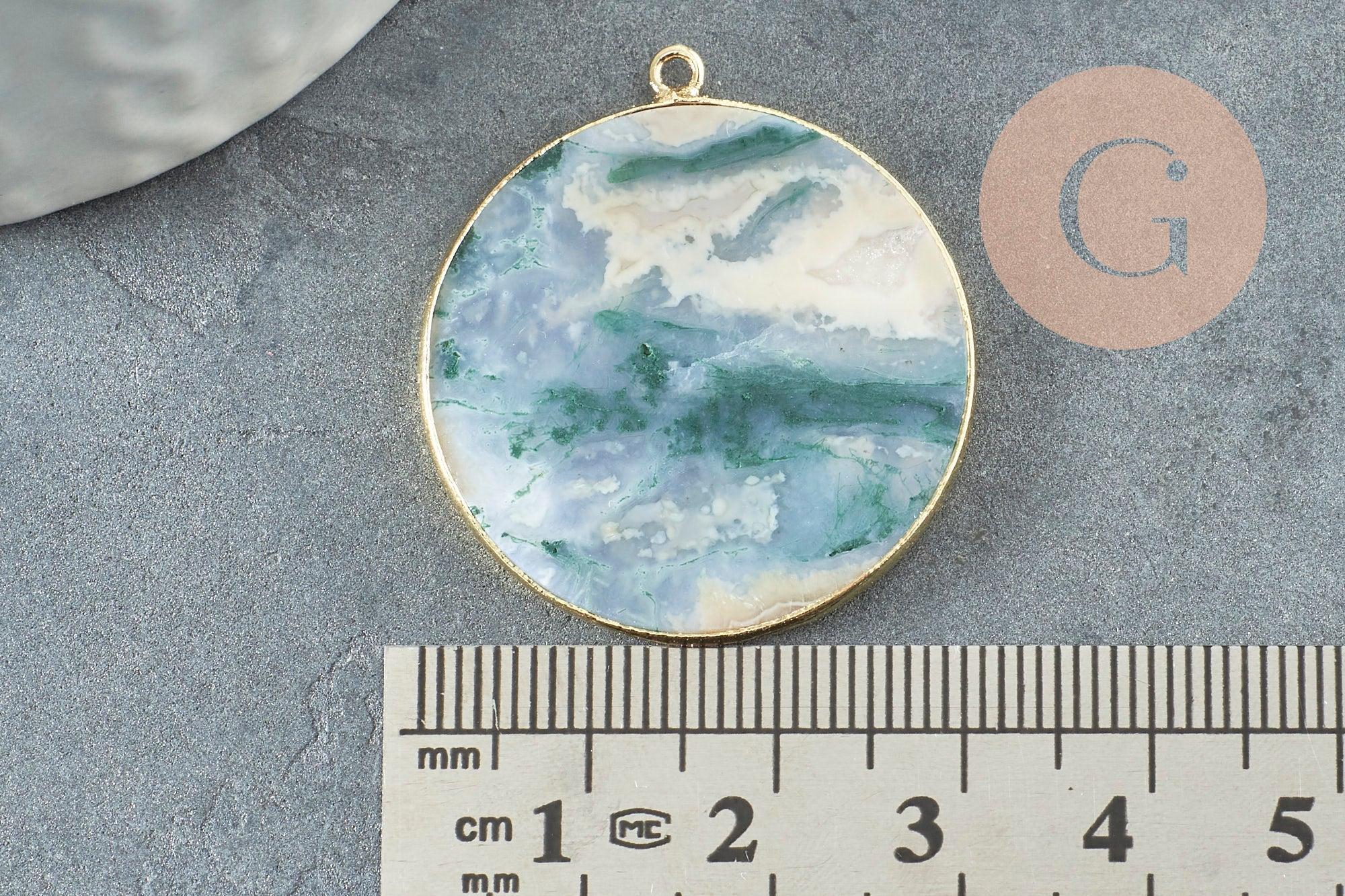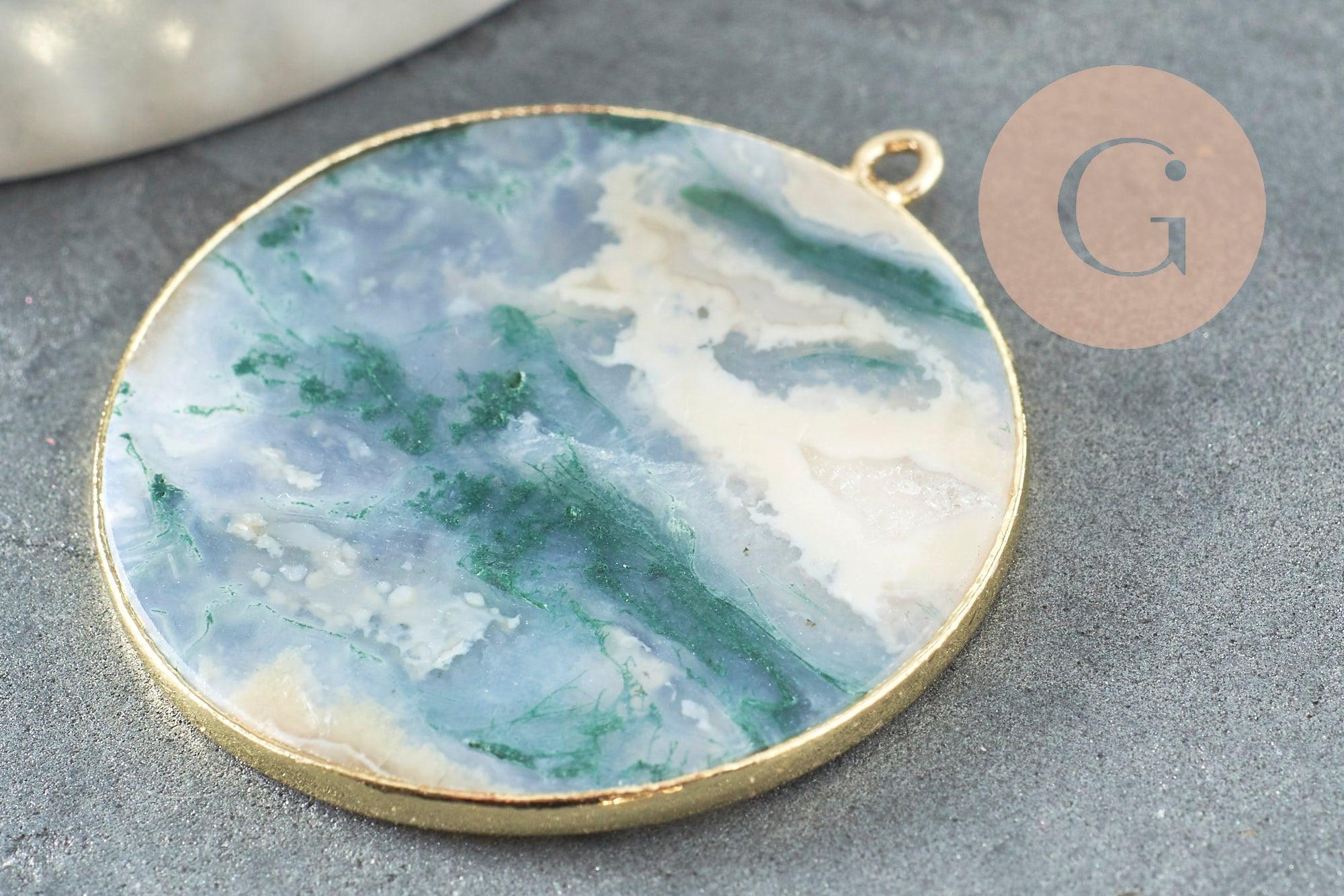 Añade un toque natural y elegante a tus creaciones con este colgante redondo en ágata verde musgo natural .