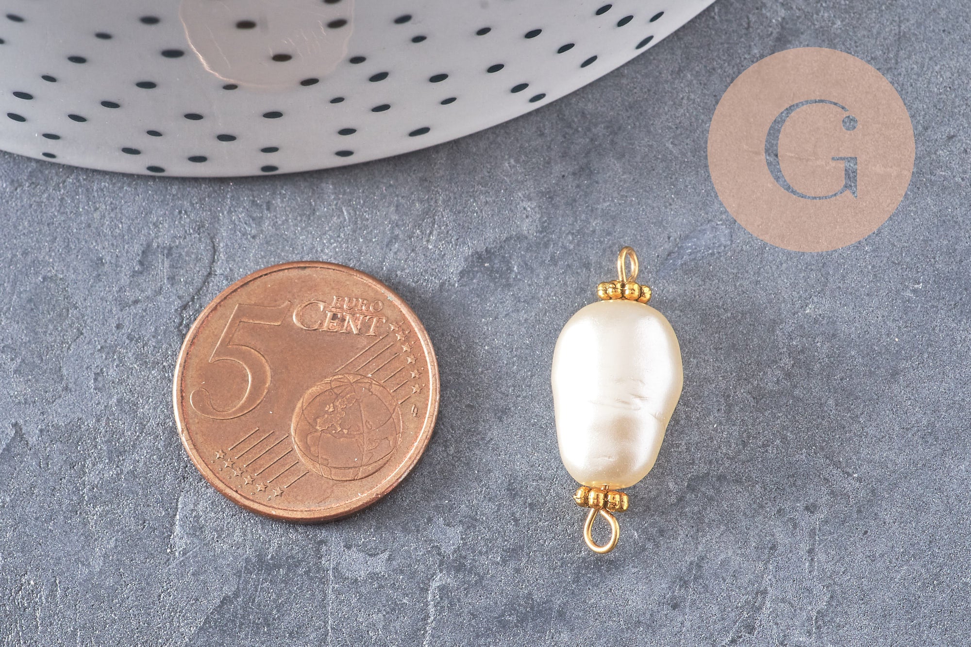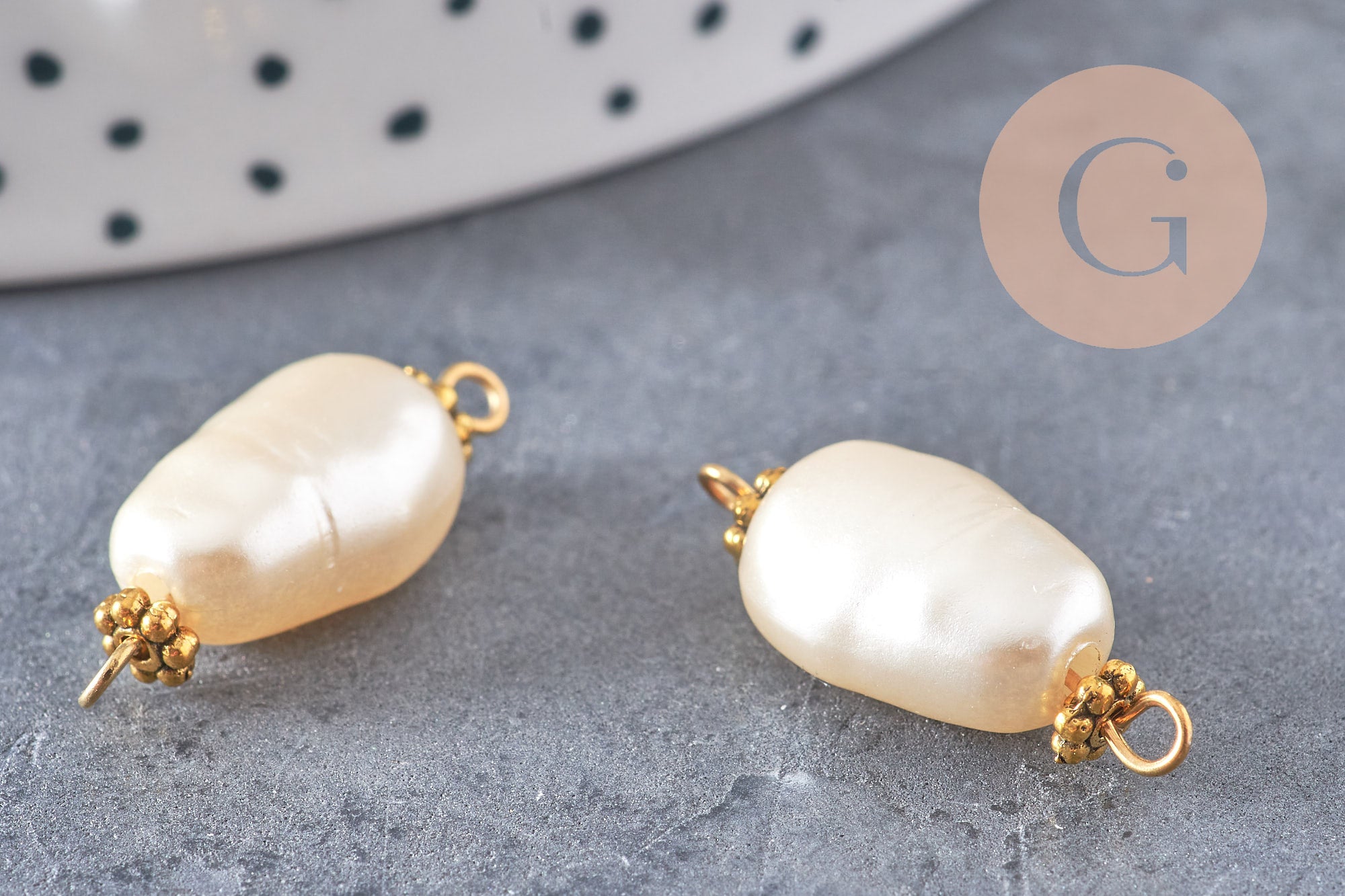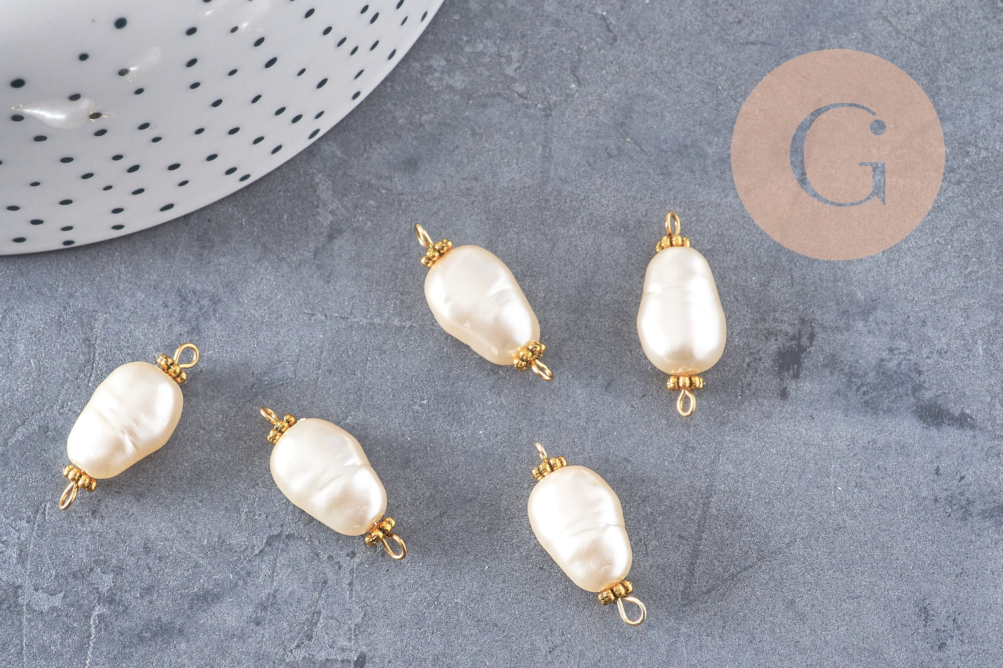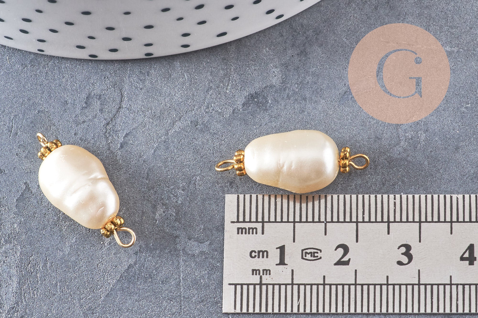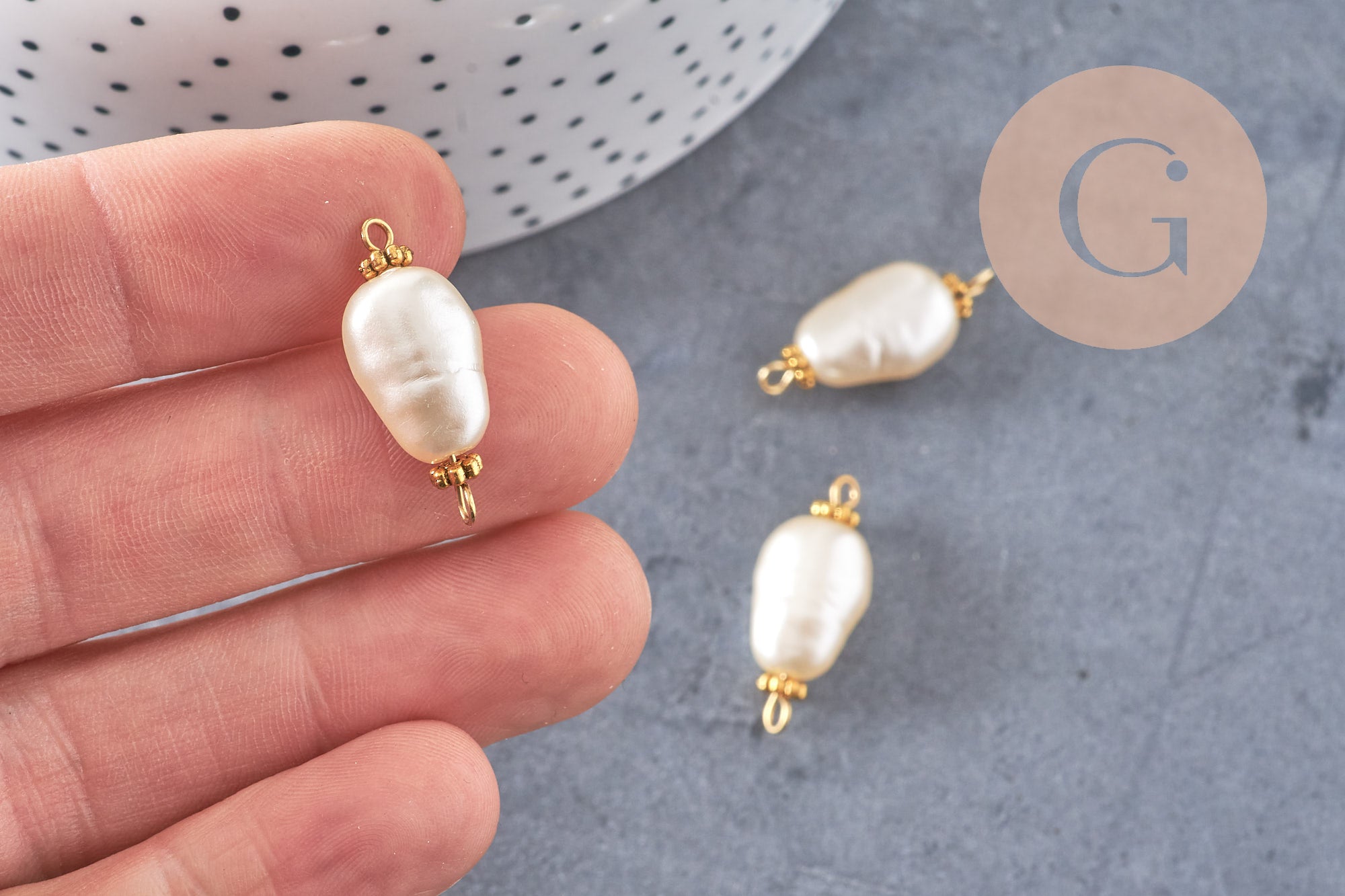 Dale un toque elegante y refinado a tus creaciones con este conector de plástico de imitación de perla de agua dulce , montado sobre elementos de zamac dorado. Ligero y brillante, imita a la perfección el brillo de las perlas reales, a la vez que es muy accesible.