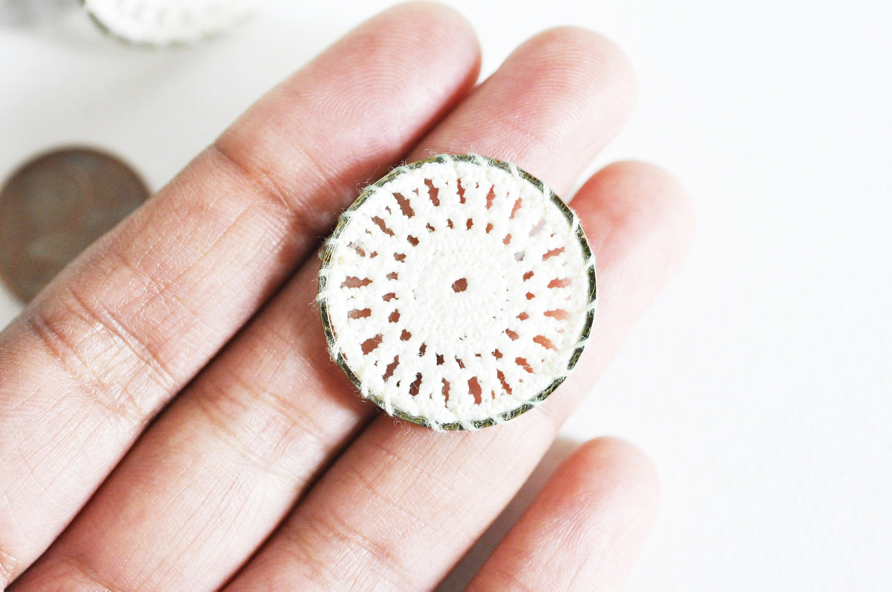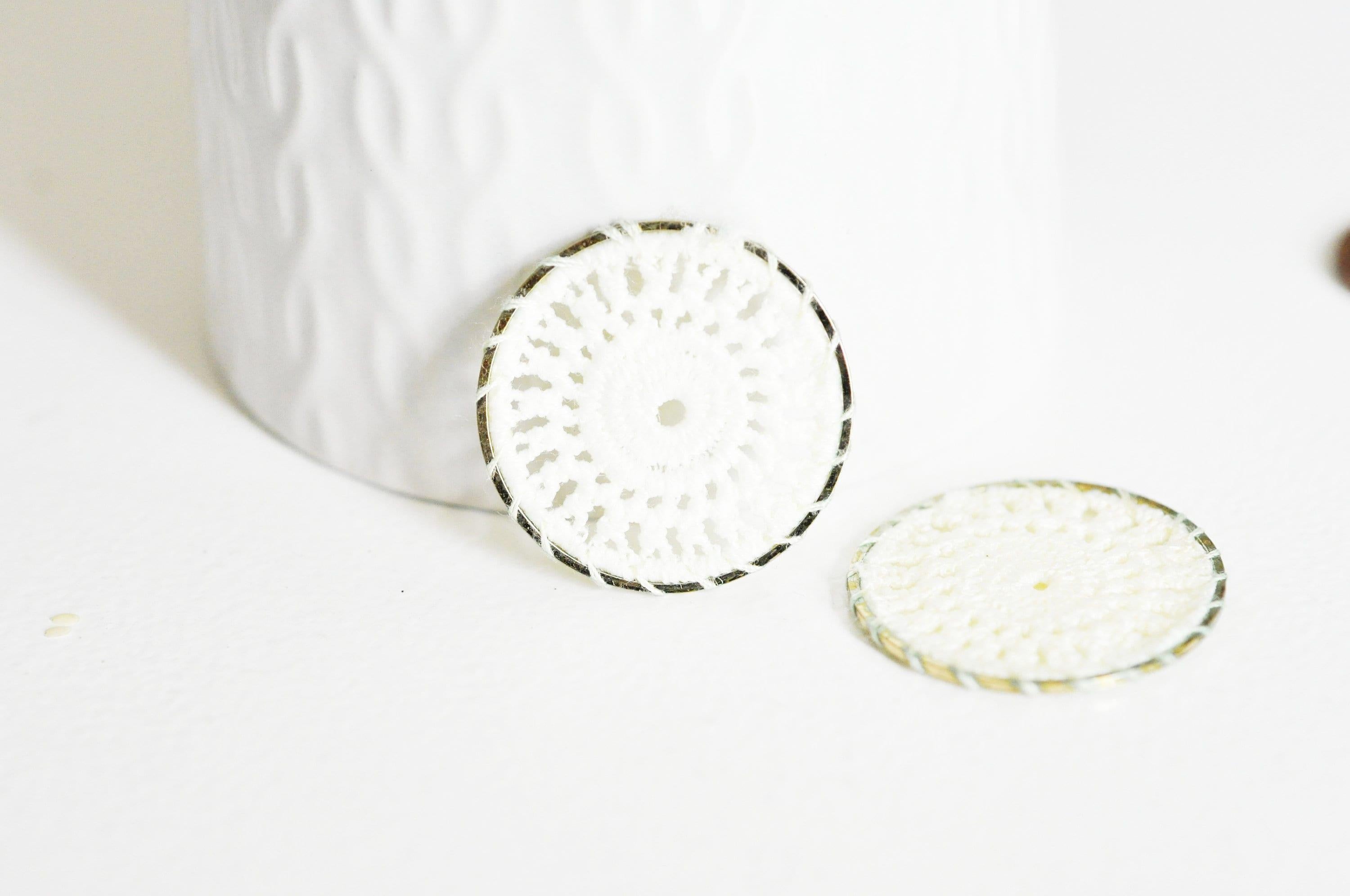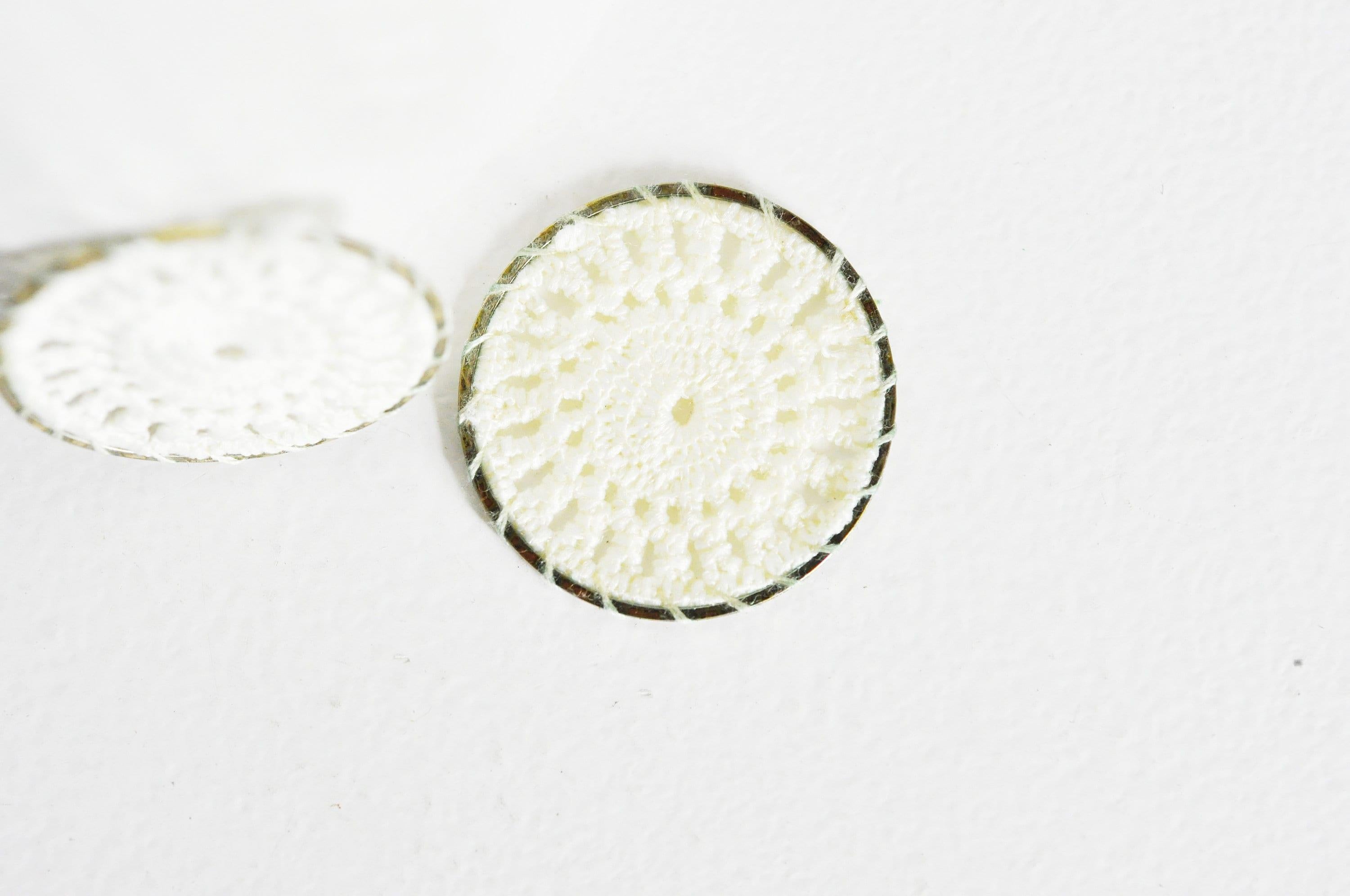 Colgante de crochet blanco, bonito encaje sobre un círculo de latón dorado, ideal para crear un collar o unos pendientes con un espíritu muy vintage y bohemio.
