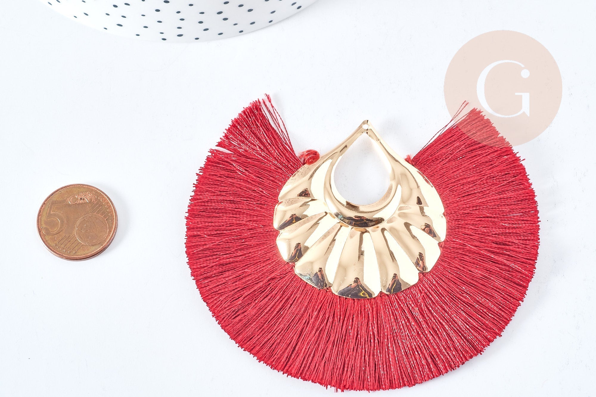 Colgante grande con borla, alambre rojo oscuro, base de hierro chapada en oro, 85-92 mm, colgante de joyería XXL, x2 (G8375)