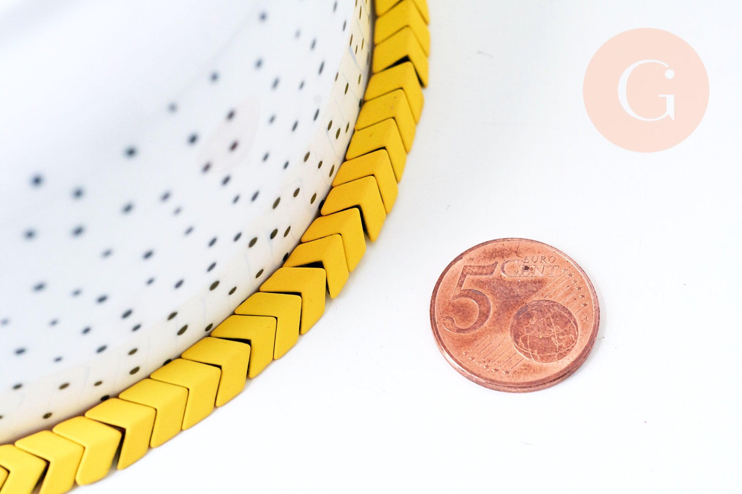 Estas cuentas de chevron de imitación de hematita pintadas de amarillo son ideales para crear bisutería DIY. Coloridas y llamativas, estas cuentas son tendencia para crear joyas DIY.