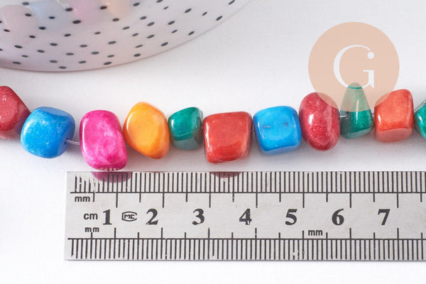 Una tira de aproximadamente 130 cuentas de jade facetadas teñidas en diferentes colores.