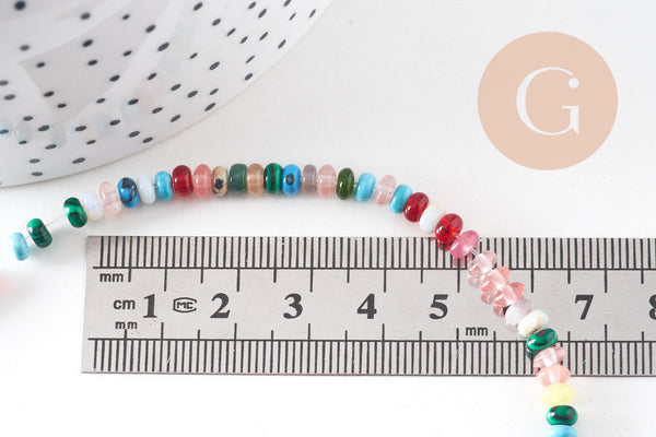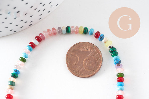 Una hermosa tira de cuentas rondelle, elaborada con una mezcla aleatoria de piedras naturales y sintéticas, teñidas y sin teñir . Cada tira es única y puede contener piedras como: aventurina verde, cuarzo rosa, amatista, fluorita, citrino, ágata, jade, ojo de tigre, jaspe, turquesa sintética, opalita y muchas más.