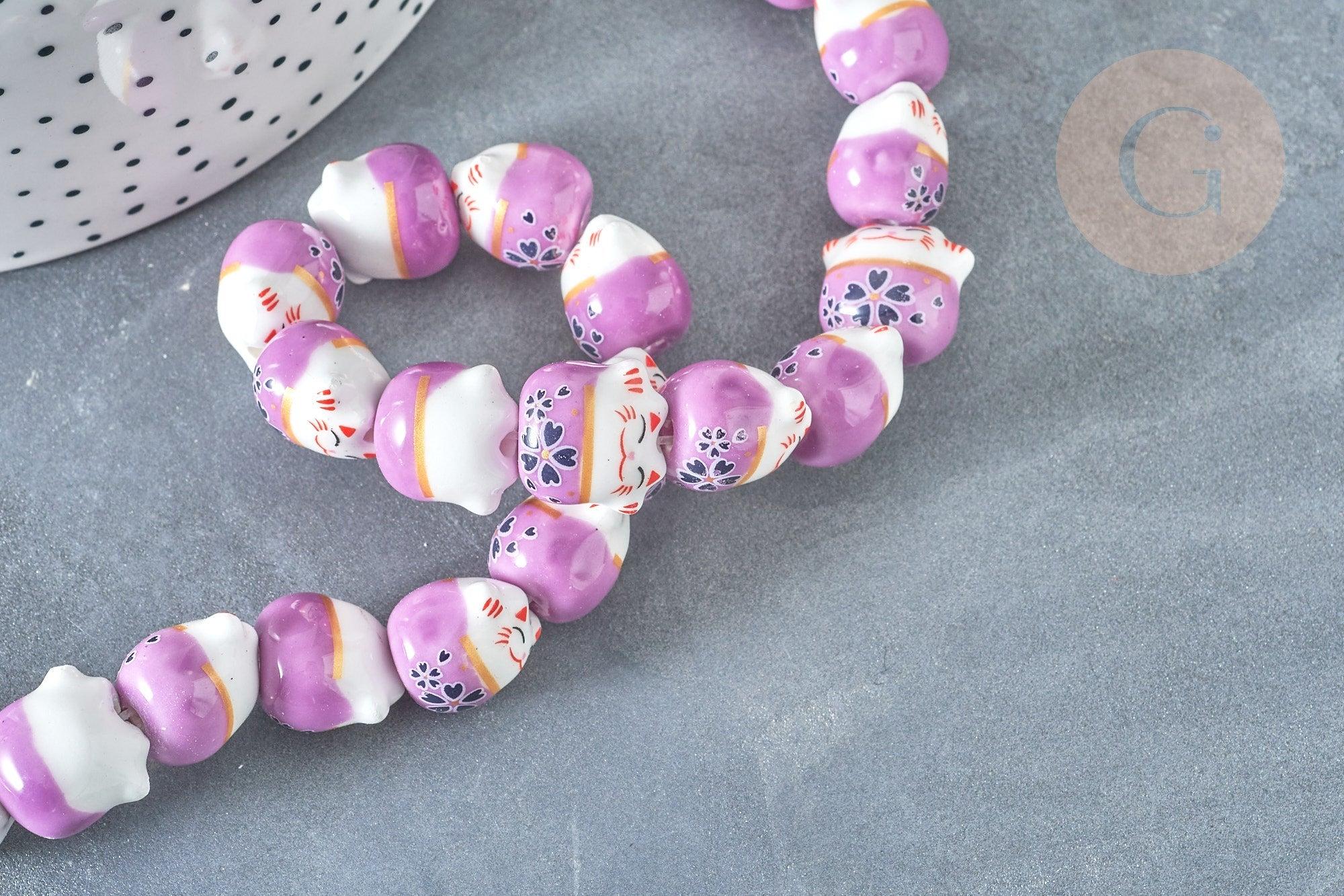 Perle Chat chanceux porcelaine violet 14mm, perle céramique, fabrication bijoux animal, perle chance, x5 G7997