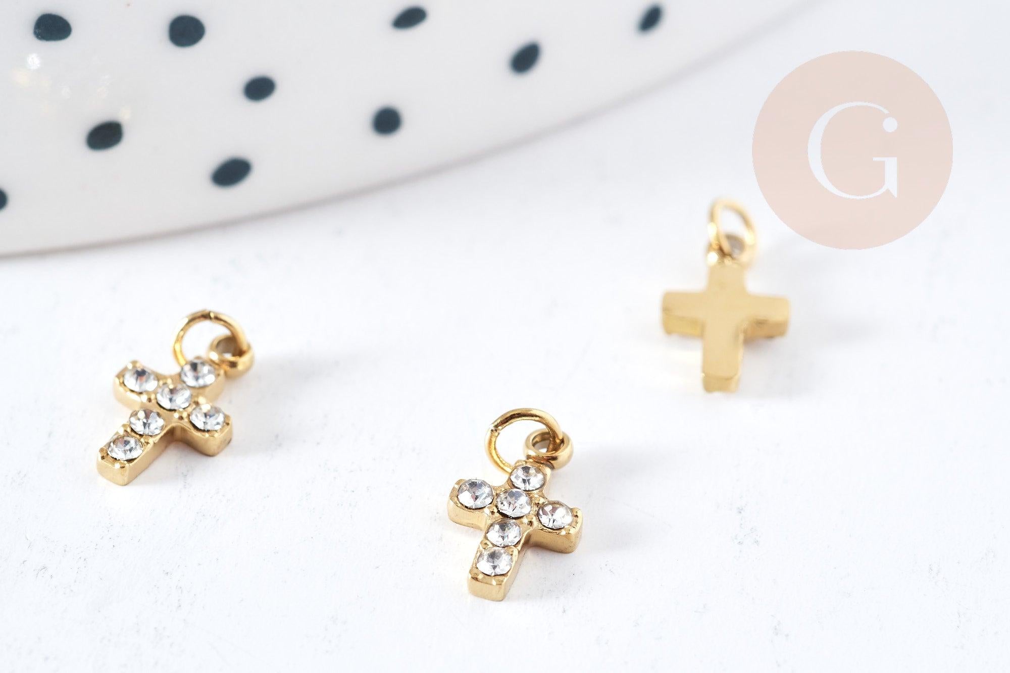 Agregue un toque de espiritualidad a sus creaciones de joyería con este colgante en forma de cruz de acero inoxidable 316 chapado en oro , adornado con brillantes circonitas. Con su tamaño compacto de 8,5 mm, este colgante es ideal para representar su fe en sus joyas de bricolaje.