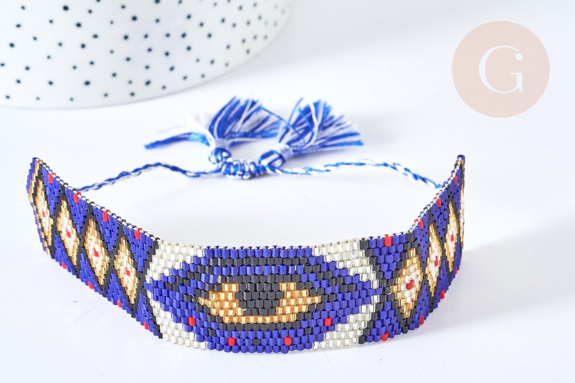 Un magnífico brazalete azul tejido con cuentas , una pulsera ajustable con cordón de nailon azul. En el centro del mismo está representado un ojo protector con la técnica del telar , elaborado con rocallas.