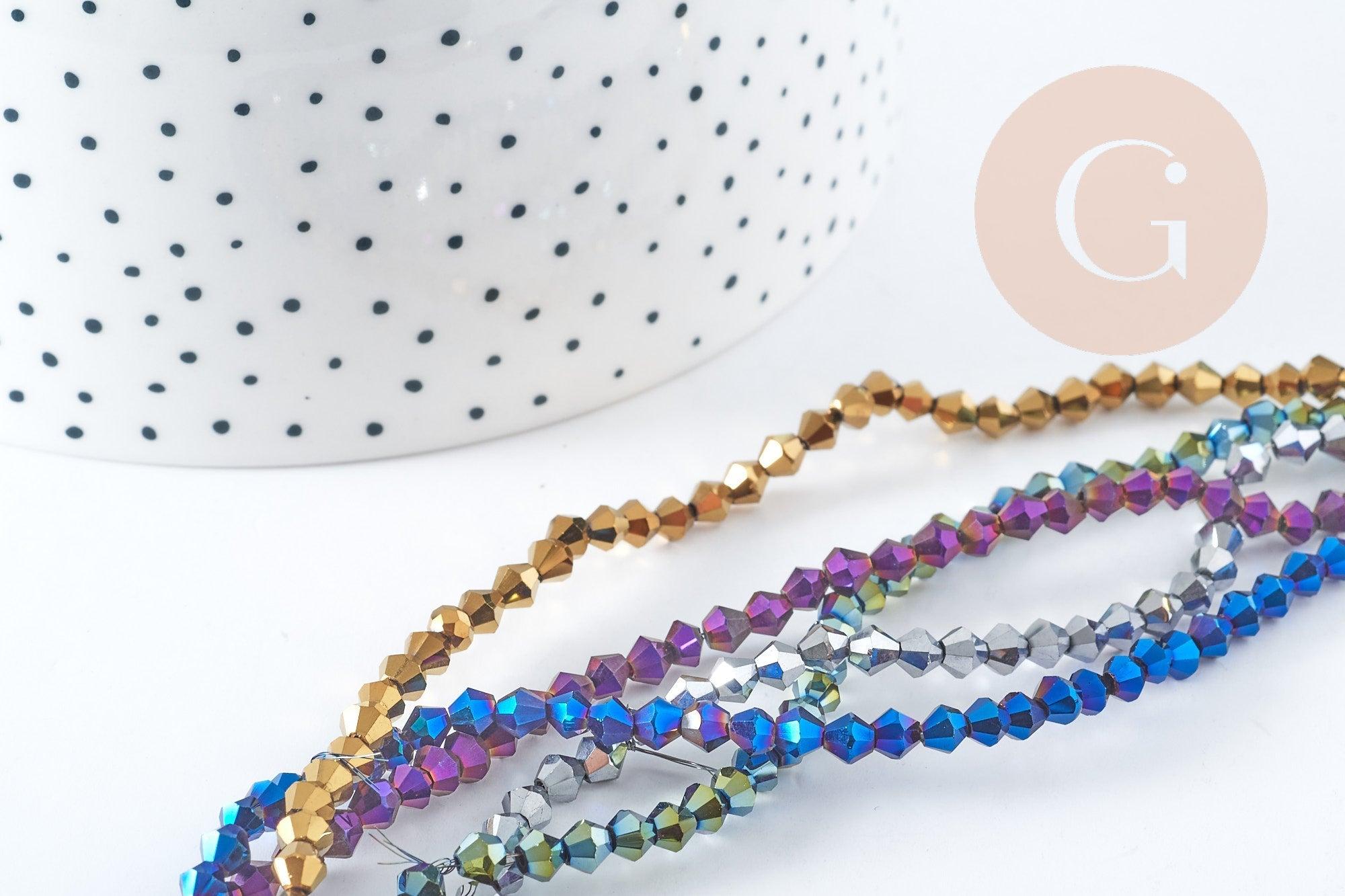 Añade un toque de luz y color a tus creaciones con estas cuentas bicónicas de vidrio iridiscente arcoíris . Perfectas para hacer rápidamente pulseras, collares o collares llamativos , ofrecen reflejos brillantes en tonos dorados, plateados, azul marino, morados y multicolores para un efecto deslumbrante y moderno.