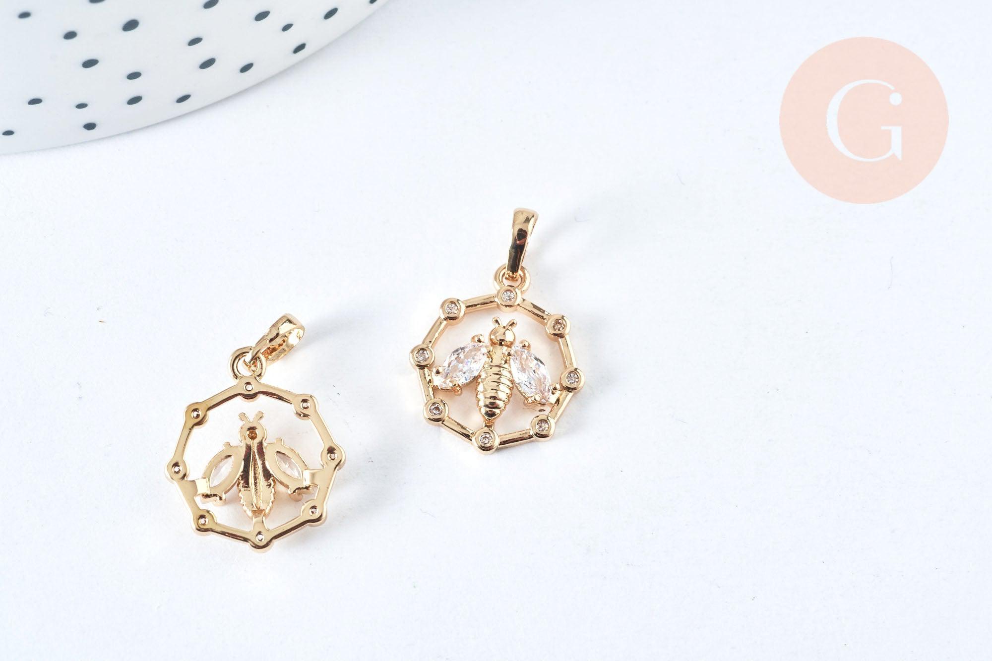 Colgante de medalla de abeja con circonitas de latón dorado de 18 mm, suministros de joyería, dije de latón y circonitas, x1 G6958