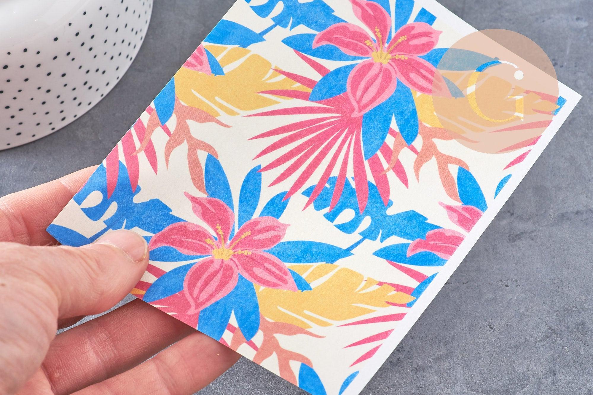 Dale un toque exótico y colorido a tus creaciones con esta lámina de transferencia de arcilla polimérica . Su diseño de grandes flores tropicales en tonos azules, amarillos y rosas es ideal para crear joyas brillantes y veraniegas inspiradas en la selva y las vacaciones soleadas.