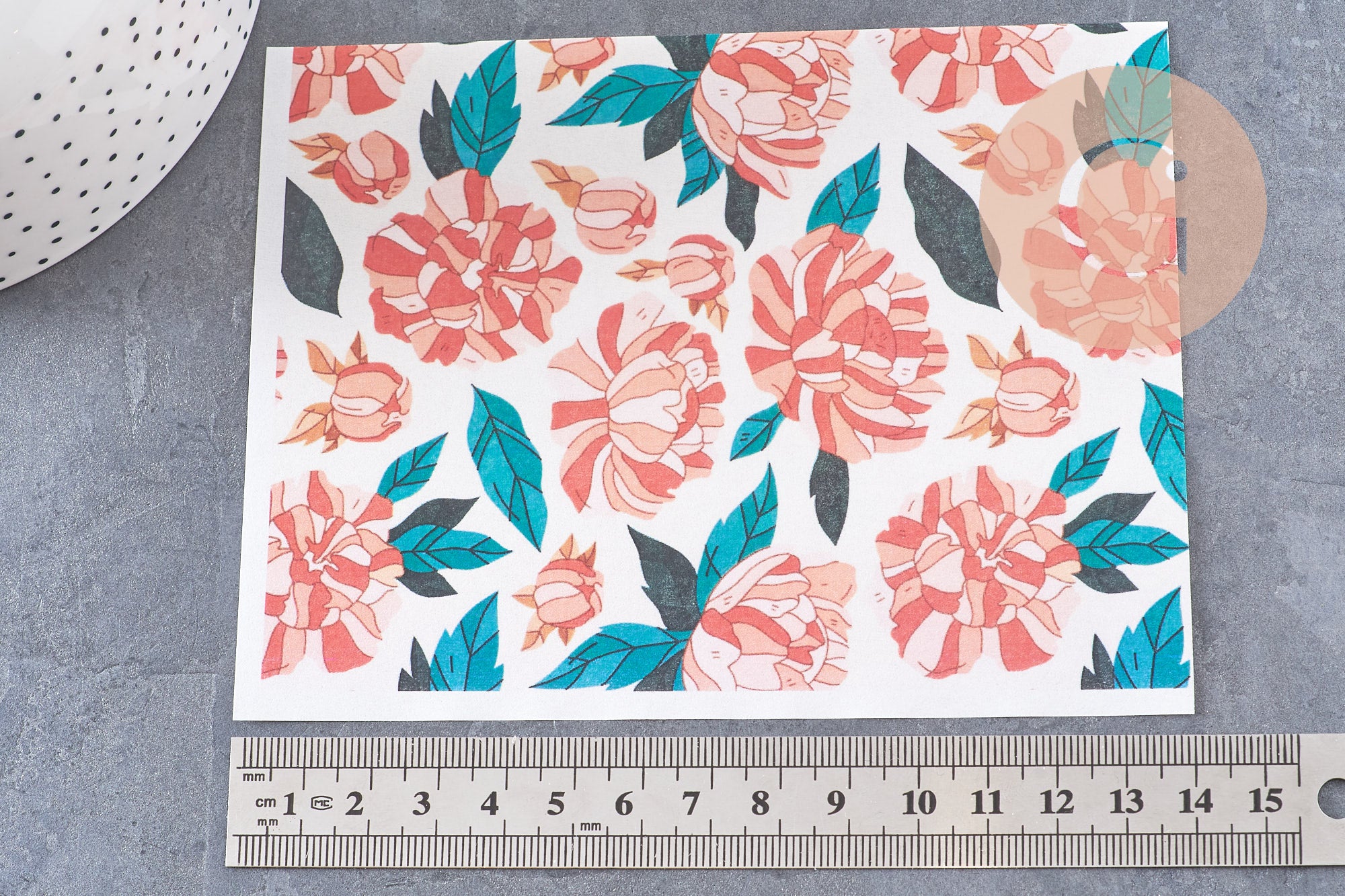 💗Aplica el transfer sobre una pasta blanca o pálida para revelar la intensidad de las flores estilizadas.