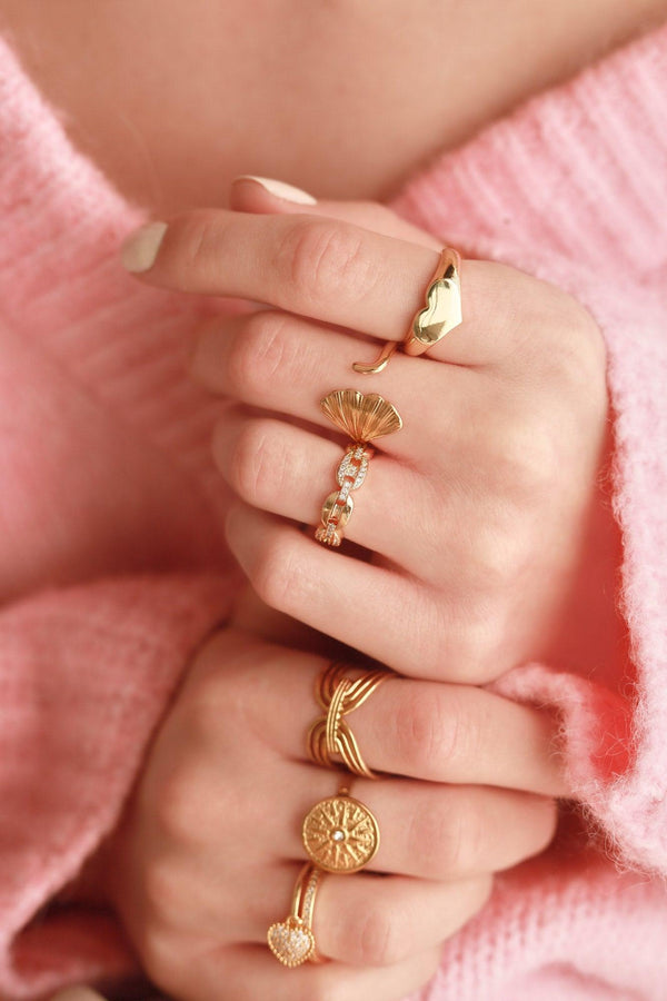 Este anillo de sello en forma de corazón está fabricado en acero inoxidable en tono dorado, lo que lo convierte en el accesorio perfecto para complementar cualquier conjunto, ya sea para una ocasión especial o para el día a día.