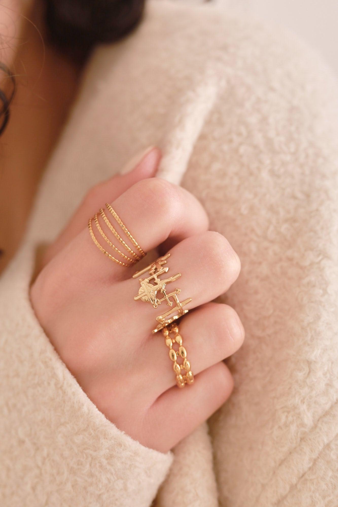Este fino anillo ajustable de 4 anillos es una joyería elegante y moderna para mujer, hecha de acero inoxidable 304 en tono dorado de alta calidad .