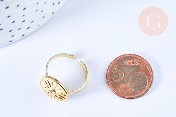 Bague réglable médaille soleil cristal acier doré Taille 54, x1 (G6408)