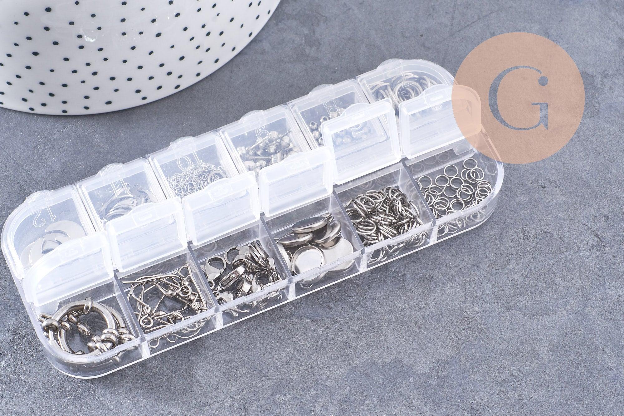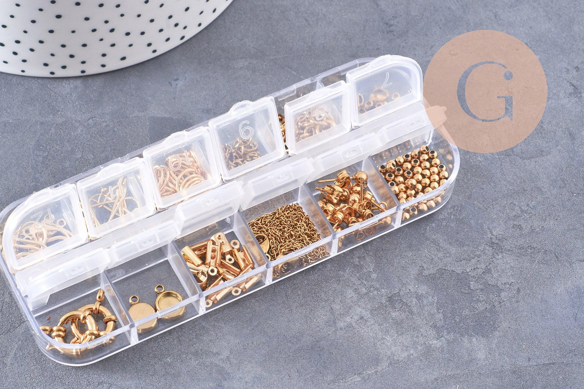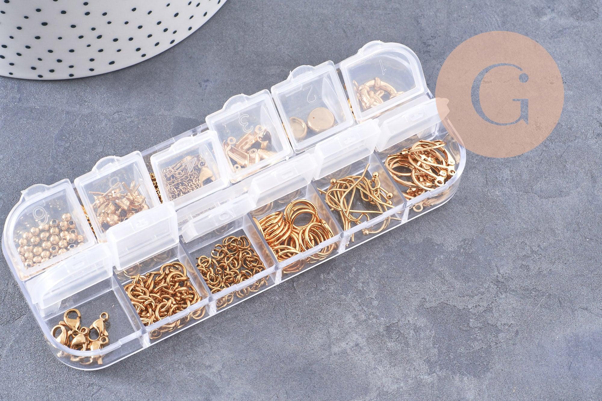 Kit caja mix de 12 tipos de suministros para joyería en acero inoxidable dorado o platino, x1 (G10142/G10143)