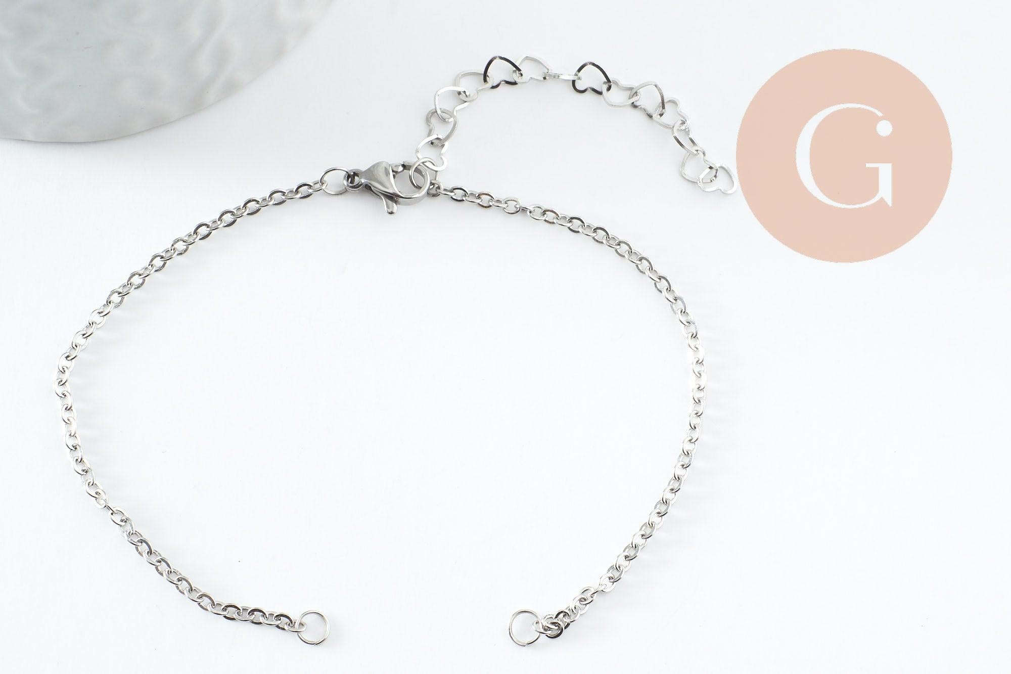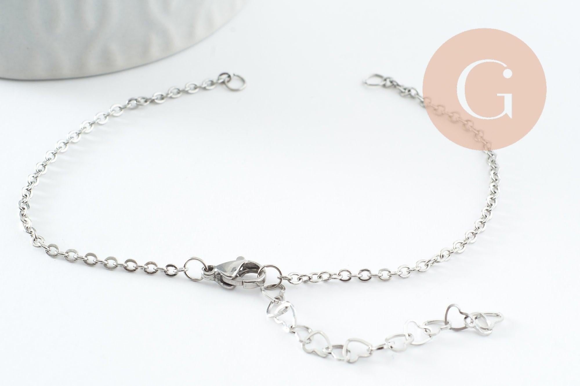 Base de bracelet maille forçat acier inoxydable 304 platine avec anneaux et chaine d'extension coeurs 18mm, x1 (G9499)