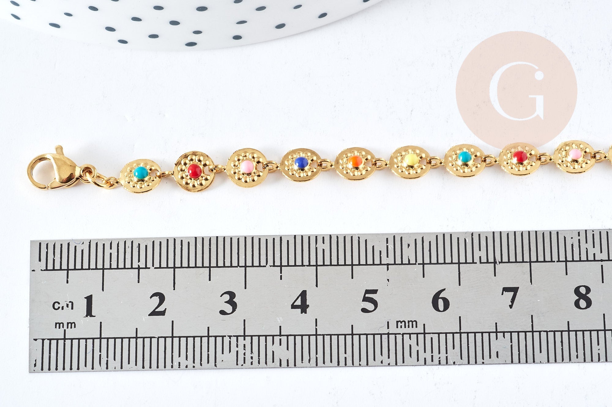 La pulsera con medallón de acero inoxidable dorado 304 es una elegante y colorida pieza de bisutería . Las medallas de esmalte multicolor de 25 mm de diámetro añaden un toque divertido y alegre a esta pulsera.